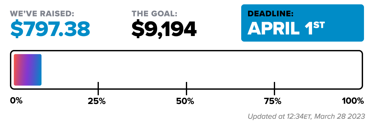 As you can see, we still have a major portion of our goal left to fundraise, but thankfully we still have time to turn this momentum around.