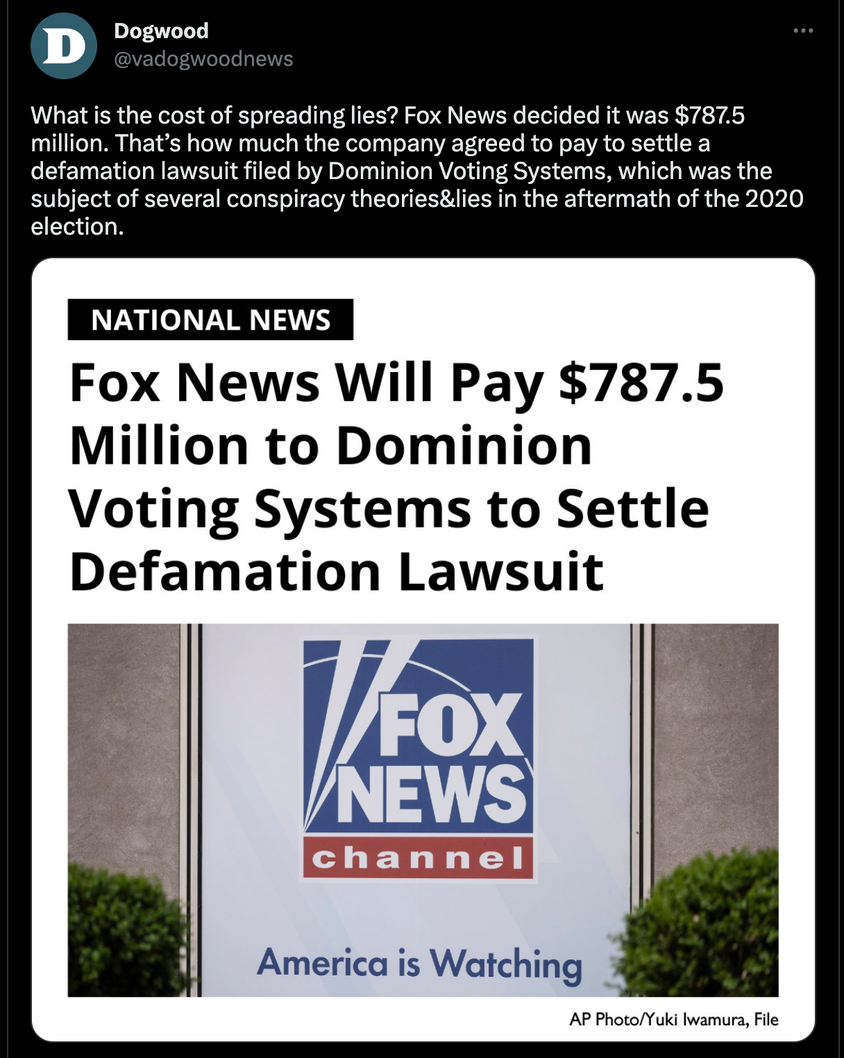 But the consequences of this case go beyond a steep price tag. The reckless, profit-driven actions of Fox News have damaged our democracy and undermined people’s trust in the news.