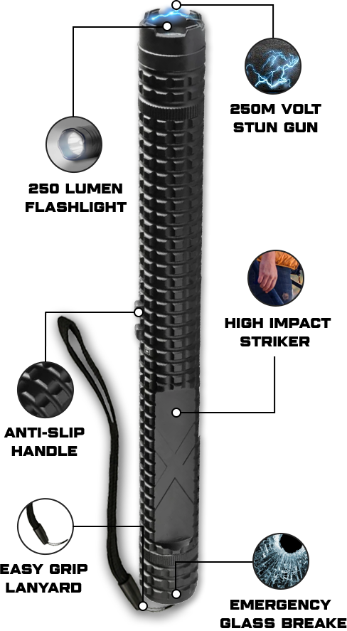 It combines a Tactical Baton, LED Flashlight, and Mega Stun Gun, all in one compact, lightweight, and durable device that's easy to carry.