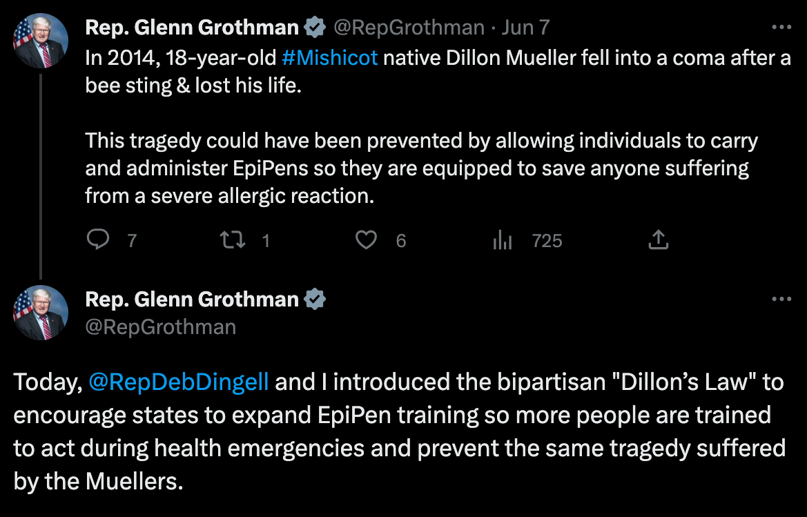 In case you missed it, President Biden recently vetoed a congressionally-passed effort to block student loan forgiveness. Thanks to Biden and Baldwin, Wisconsin taxpayers could be stuck footing the bill for this Student Loan Bailout, which is estimated to cost American taxpayers $1 trillion, roughly $2500 per person. Furthermore, the Tax Foundation found that Biden’s bailout is likely to increase our deficit by more than $350 billion, worsening inflation. Once again, the Biden Administration is demonstrating their lack of empathy and care for the hard-working men and women of Wisconsin. Even members of his own party, including former economic advisor, Jason Furman, understand the detrimental effects that this student loan forgiveness is bound to have on our already suffocating economy. | Just this week, Congressman Glenn Grotham introduced Dillon’s Law, a bill that will encourage states to let “good Samaritans” step in and save lives. Dillon’s Law gives resources to local governments’ to train their residents to carry and administer epinephrine. This bill is inspired by Dillon Mueller, native of Mishicot, Wisconsin, who tragically passed away in 2014 at the age of 18 after being stung by a bee and falling into a coma due to anaphylaxis. |