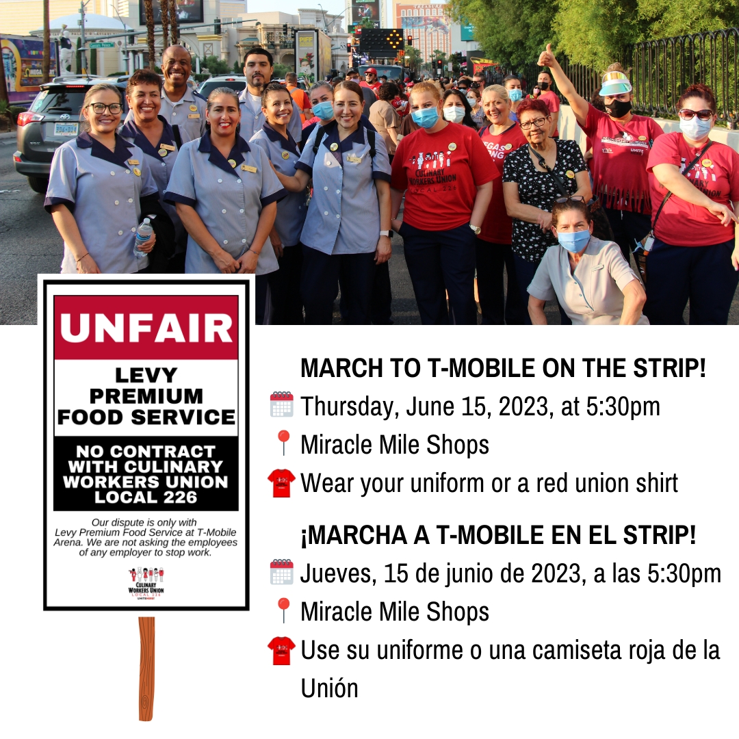 Hundreds of hospitality workers are going to be hitting the streets to march to T-MOBILE on the Strip in support of Levy Premium Food Service workers at the T-Mobile Arena who have been fighting for a strong union contract since September 2022!