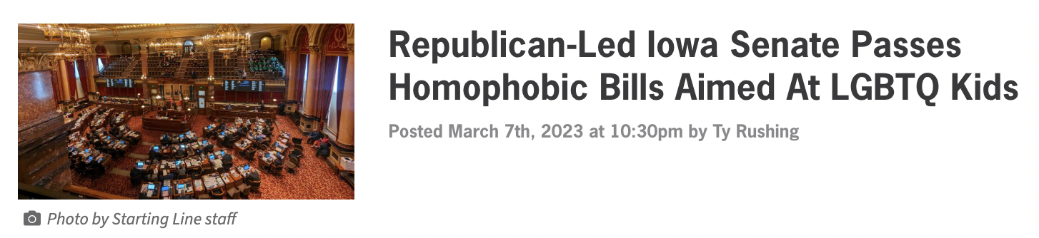 That’s exactly why our team at Iowa Starting Line has been hard at work correcting the record. We’ve used our reporting to give a voice to LGBTQ+ students impacted by a slew of discriminatory bills including a ban on gender-affirming care for trans youth. We’ve also put Iowa lawmakers in the hot seat when they’ve used their position to push their own spiteful agenda.