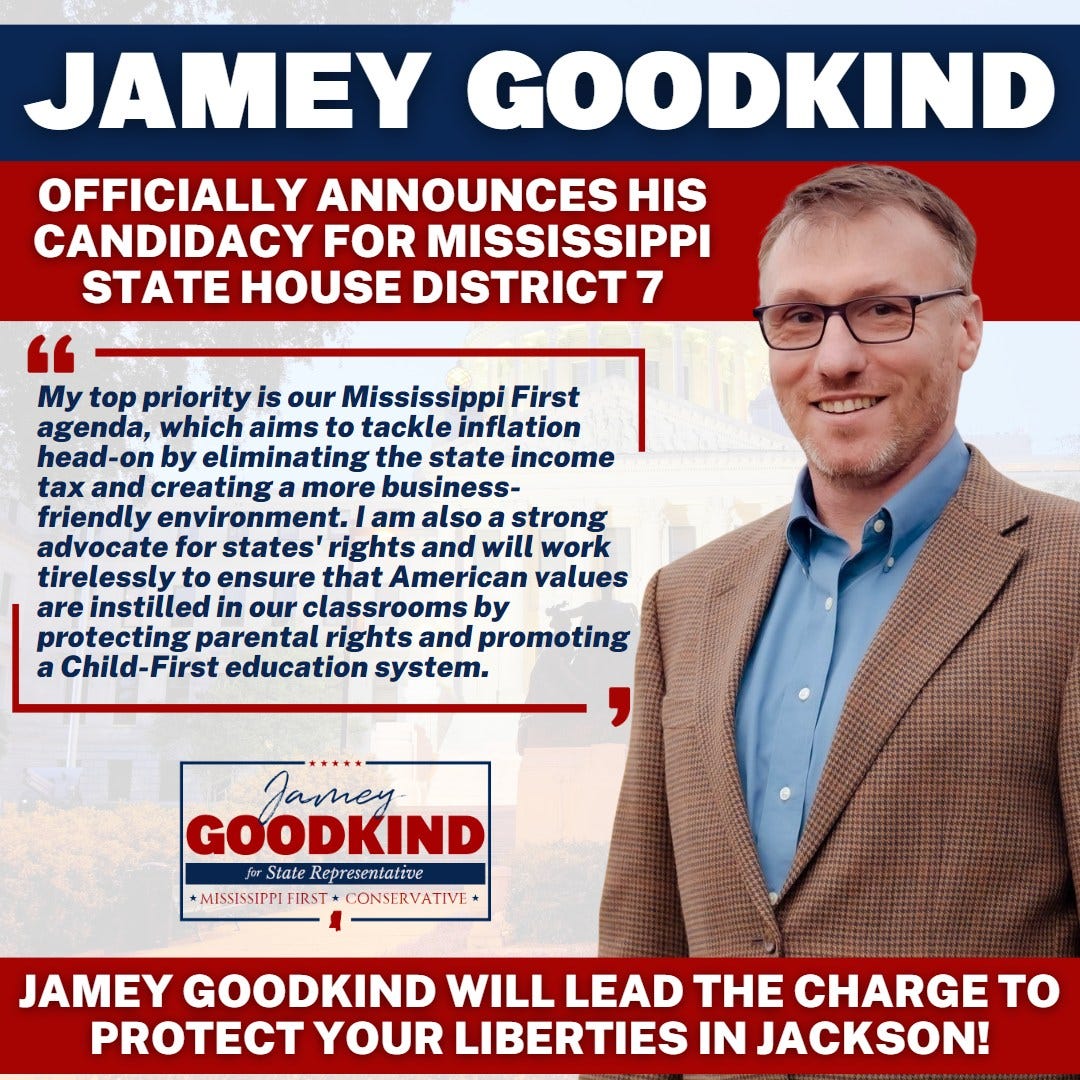 from the desk of Dana Criswell Our founding fathers designed a system of government that was “by the people”. They envisioned a government unlike any other government ever build. This new government, our government, would be run by every-day citizens. Jamey is that “every-day” citizen. He is not a career politician who has spent his life living off the people, nor will he become a politician for life. When elected Jamey will make decisions based on the christian conservative principles and values that made our nation and our state great. I encourage you to check out Jamey’s website at www.GoodkindforMS.com and give him your support. Read all of Dana’s post and stay informed about politics in Mississippi |