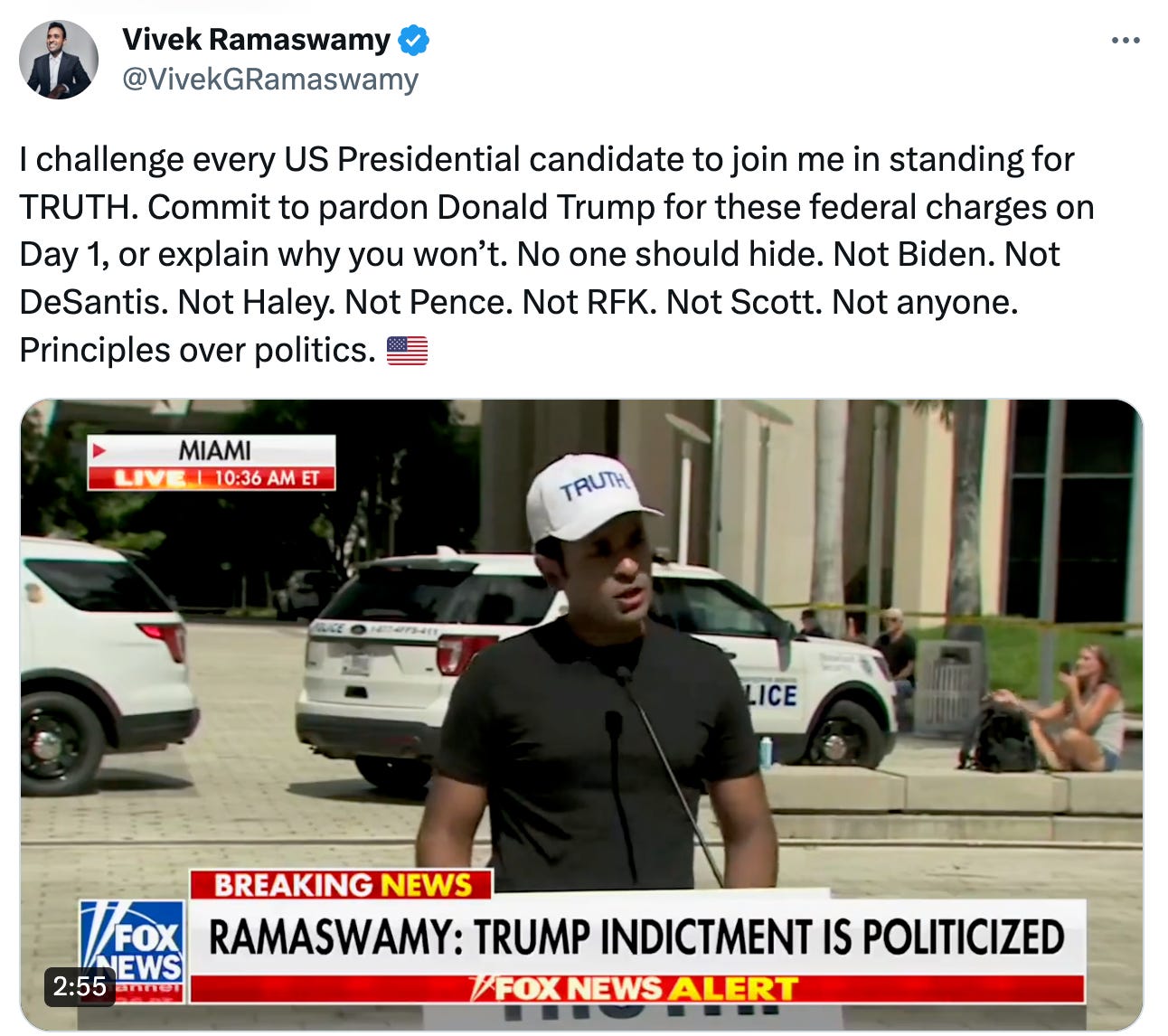 Did you see what just happened?! We just witnessed an electrifying moment as Vivek Ramaswamy threw down the gauntlet! He challenged every presidential candidate, regardless of party affiliation, to step up and commit to pardoning President Donald Trump. I had the honor of delivering the opening remarks at Vivek's press conference (full remarks below), where I highlighted the broader significance of this issue. As some of you may remember from my 2022 Senate campaign, Donald Trump endorsed Dr. Oz instead of me in the Republican primary only for Dr. Oz to lose in the general election. Backing Dr. Oz obviously did me no favors or in the end, the people of Pennsylvania. This transcends the presidency itself. This is about YOU! However, it is crucial to recognize that this is not about me or Dr. Oz or even Trump. This transcends the presidency itself. This is about YOU, the people! If they can subject a former president to such treatment, what's to prevent them from doing the same to you? This isn't a time for playing it safe or staying on the sidelines. The destructive forces of division and anger have plagued us as a nation for far too long. Vivek's call is an invitation to mend our wounds, bridge our differences, and construct a more robust and prosperous America. Never forget that forgiveness and mercy are signs of strength, not weakness. Let's be clear: this is about what’s best for our nation, but it’s not about evading accountability. Our legal system will address any alleged wrongdoings, but we must not allow ourselves to be trapped in an endless cycle of retribution. Now is the time to leave behind the shackles of division and embrace the path of peace and progress. …forgiveness and mercy are signs of strength, not weakness. Together, let's seize this extraordinary opportunity at this pivotal moment in our nation's history and refuse to shrink. They're no longer hiding their bias and criminality. They're doing it in right in your face! So what are you going to do about it? I’m talking to you, Tim Scott, Nikki Haley, Ron DeSantis and the rest of the GOP. If you want to lead us, then prove it! Follow Vivek’s lead and stand up for your country, not just your political ambitions. With few exceptions, most of you did nothing when they locked down our country. You did nothing when they locked up innocent citizens who attended a rally on Jan 6. You missed those shining opportunities to lead. So here you go. Here's your chance to lead, served up on a silver platter. Will you take it? Kathy Barnette P.S. Don’t forget to RSVP for Vivek’s Town Hall on June 20th at 5 pm ET with The Benny Johnson Show! [Transcript of Kathy’s Remarks]