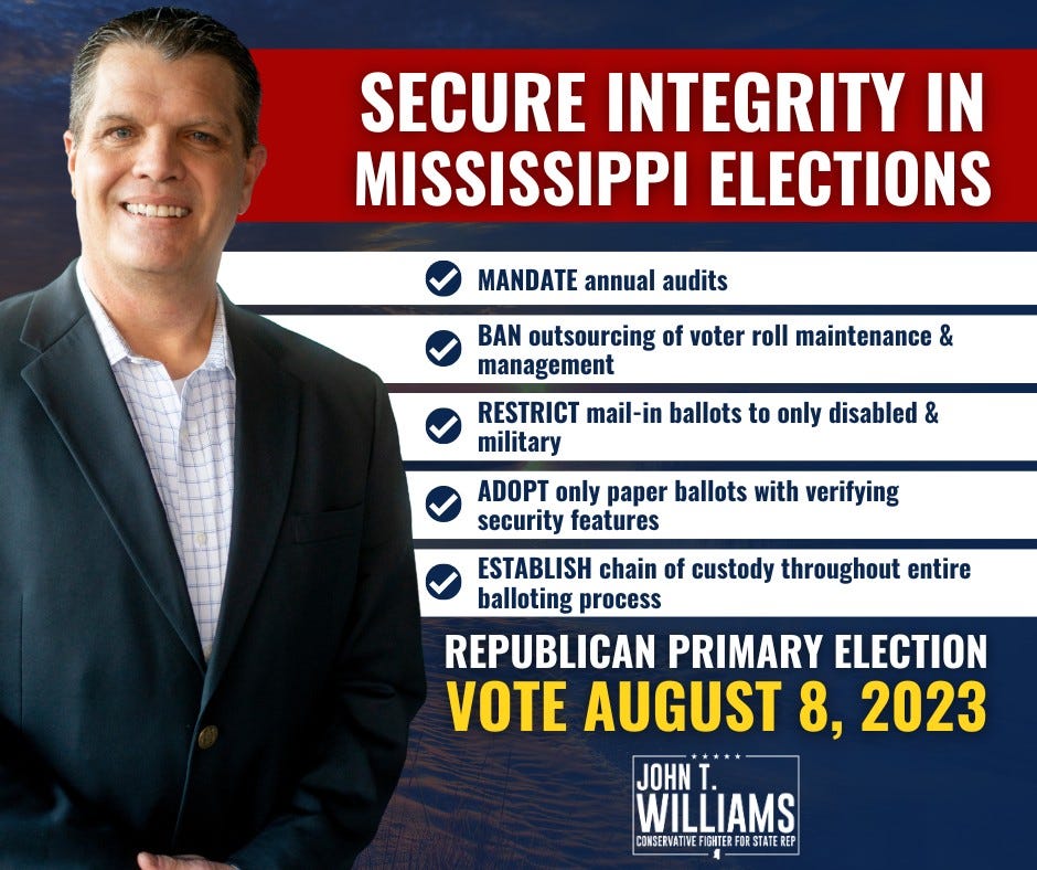 from the desk of Dana Criswell Desoto County needs fighters in the Mississippi legislature and John is one of the best. To survive in the Mississippi legislature without compromising your principles it takes a person like John who is well grounded in their beliefs and principles. John has served on the steering committee for the Mississippi Freedom Caucus and has been invaluable to the caucus. John has a proven record of fighting for your rights and freedoms without compromise. As you do your research I know you will come to the same conclusions that I have about John. Check out John’s website at www.WilliamsforMS.com John needs your vote and your support. Read all of Dana’s post and stay informed about politics in Mississippi |