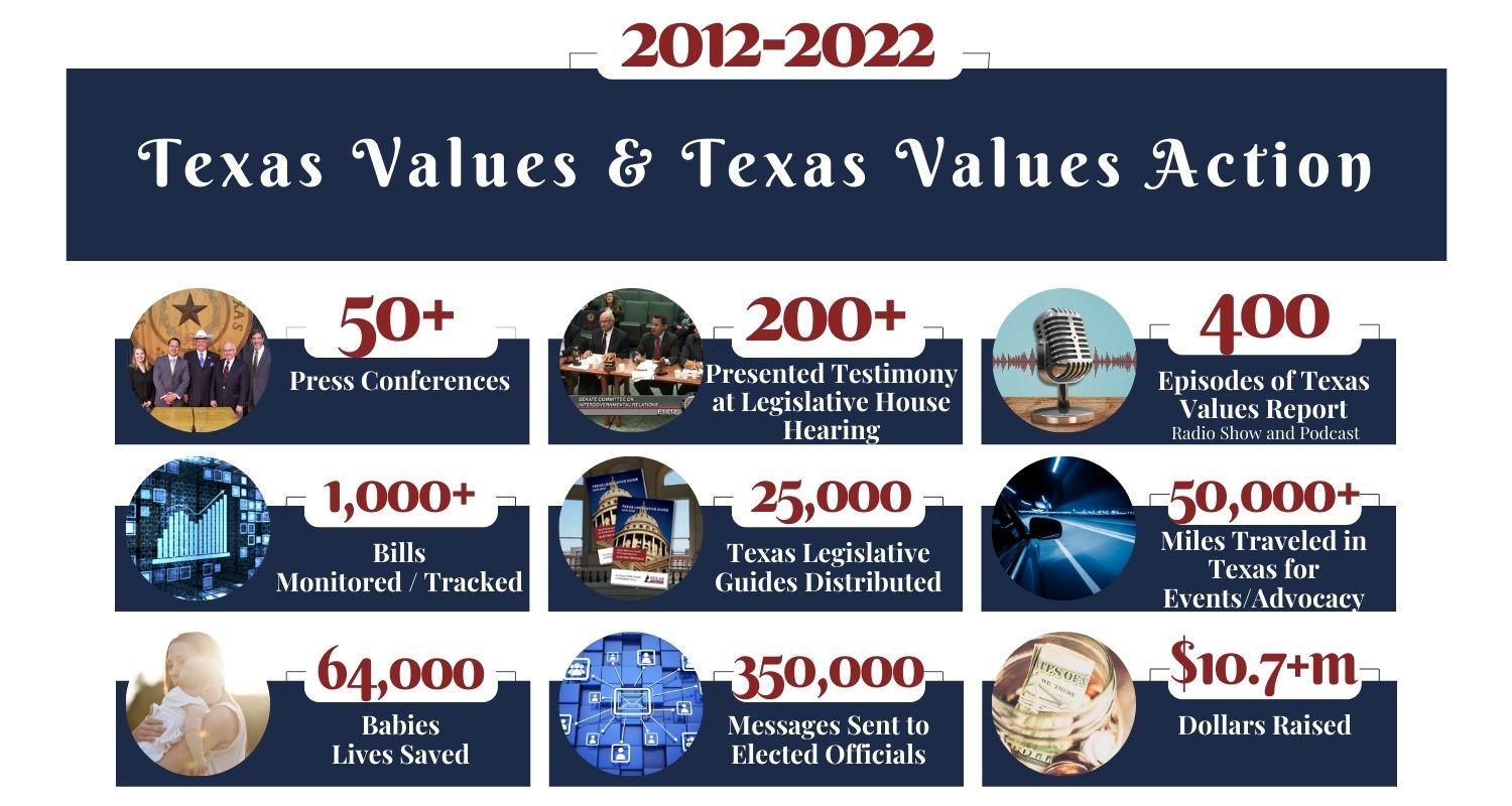 This past decade has brought many blessed achievements to Texas via the Texas Values Team who've spent many long days, every day at the capitol during this Legislative Session, advocating to preserve YOUR values of Faith, Family & Freedom for future Texans. We cannot do it without YOUR support! Our fiscal year ends in just two short weeks!