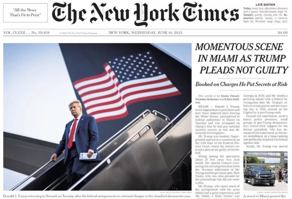 But rather than focusing on the 37 charges brought against Trump by the Justice Department or the widespread misinformation campaign he’s pursuing, the Times chooses to center the fact that he pled not guilty, calling it a “momentous scene.”