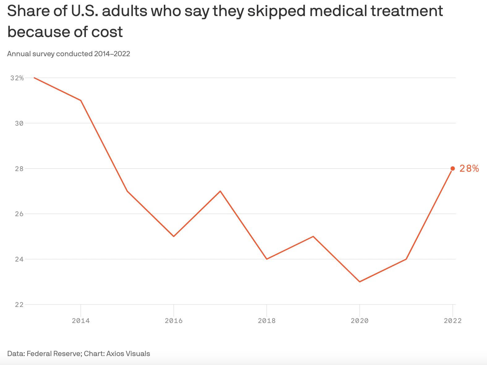 The share of people in the U.S. who skipped medical treatment last year because of costs rose substantially compared to 2020 and 2021.1