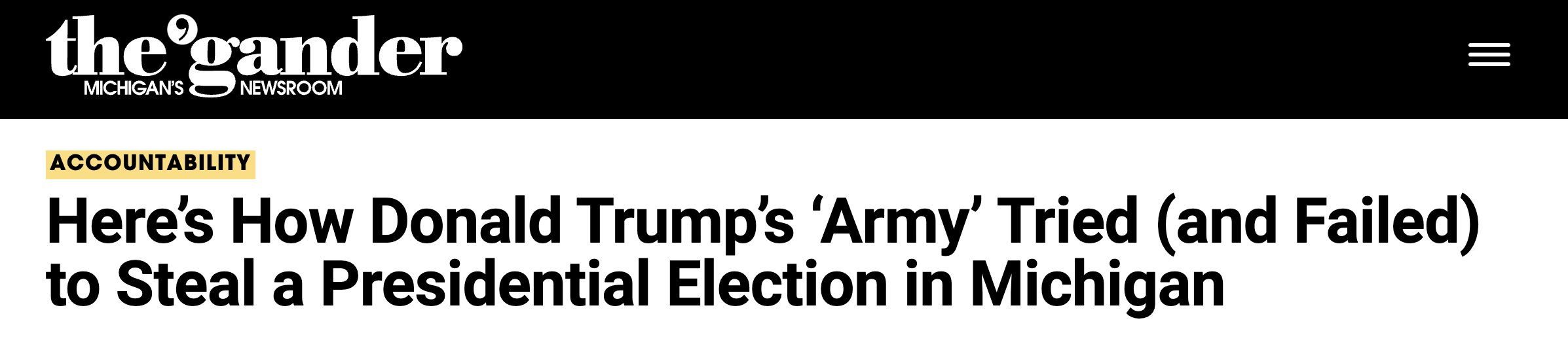 There’s no better example of this kind of high-quality journalism than this recent piece from our Michigan newsroom, The Gander. Reporter Kyle Kaminski recently published the results of an extensive investigation into attempts by Donald Trump’s insurrectionists to overturn Michigan’s 2020 election results. What he found will be concerning for Michiganders and all Americans.