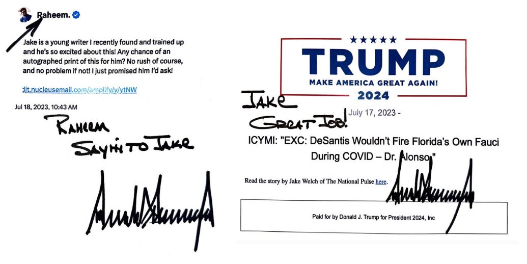FIRSTLY: Folks, another reminder that since X (formerly Twitter) no longer allows Substack links to propagate, nor be promoted, all future works will be available on TheNationalPulse.com, via the website or our Apple or Android apps. And by the way, if you get the apps, you get free push notifications of top stories from us, which will certainly enable you to better navigate the news landscape in a world where CNN or the New York Times usually “set the tone” and conservatives spend the rest of the day or week fighting back. Enough of that. The National Pulse push notifies people FIRST, so the mainstream media has to play catch up to OUR perspectives on the world. This is the way to win. So help us doing by getting the free app and leaving a review. A good one :) SECONDLY: I know I’m behind on a podcast but honestly, is there really that much to say about the campaign this week? I know, I know, everyone had “opinions” on the debate and the impact of THAT MUGSHOT. But the state of play in the race hasn’t changed as a result of either. Nor from the Tucker-Trump interview. And I’m just not one of those people who says things for the sake of viewership or clicks. But tell me if you think I’m wrong in the comments, by the way. I still come here and read them all even if Elon Musk has adopted similar boot-on-neck strategies to his predecessors. THIRDLY: Happy 100th episode to Fleccas Talks, which is also now part of the Pulse+ network that we’re building over at The National Pulse, in case you didn’t know. And if you don’t yet know Fleccas Talks, the podcast, well you’re missing out. Many people are saying it is in fact the best new podcast of all time! (You’ll get that reference if you’re a listener!) Anyway, here’s a link if you’re interested but fair warning: it’s spicy! FOURTH…LY: The National Pulse was the first news organization to publish the Trump mugshot, and I fancy that our headline was better that most, too. But mostly importantly, I spent the next few hours designing the front cover of our new, quarterly, print magazine. I want all of you to come over and subscribe to the Pulse+ so that we can get this content onto your coffee tables, side-tables, bedside tables… basically all the tables, I want to run the tables is what I’m saying. LASTLY, BUT NOT LEAST…LY: We were honored, once again, to receive some notes from President Donald J. Trump this week. I let him know a few weeks back that one of our writers, Jake Welch, would be tickled pink to hear from him and in amongst all of his problems, the former POTUS still found time to drop this young writer from England a personal note, below. Isn’t that amazing? Anyway, it’s going to be another big week of building this resilient and uncancellable news network over at The National Pulse. So I’m going to get back to that, starting this evening. I hope you had a great weekend. Raheem P.S. One of the things we’re going to be building out is a morning newsletter for you, too! It’s currently called “WakeUpRight” and you can sign up to it here, if you want. It’s also part of the Pulse+ network. Raheem Kassam's Substack is free today. But if you enjoyed this post, you can tell Raheem Kassam's Substack that their writing is valuable by pledging a future subscription. You won't be charged unless they enable payments. |