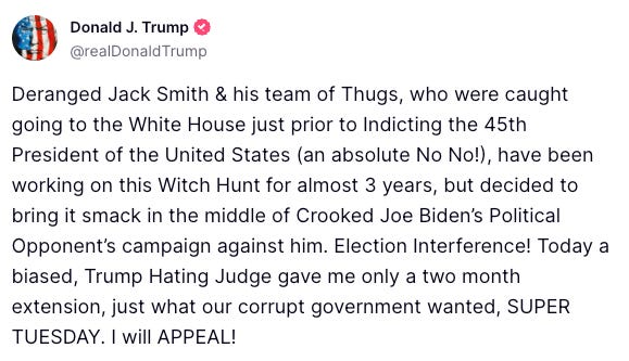Former President Donald J. Trump took to Truth Social with a series of impassioned posts on Monday, expressing his intent to contest the trial date set for March 4th. He went on to accuse Special Counsel Jack Smith of orchestrating a deliberate campaign to meddle in the 2024 election. Trump's posts, which gained substantial attention, cast doubt on the validity of the indictment against him. He highlighted the heavy reliance of the indictment on findings from the January 6th Committee, a body he derisively referred to as an "Unselect Committee of Marxists, Fascists, and Political Hacks." The former President further claimed that the committee, which he asserts has a track record of dishonesty concerning matters involving Russia and Ukraine, had purposely erased and destroyed all evidence, findings, and proof associated with the January 6th incident. On the same Monday, U.S. District Judge Tanya Chutkan set the trial date for March 4, 2024, regarding the alleged interference by former President Donald Trump in the 2020 presidential election. This timing situates the trial squarely amidst the GOP presidential primary calendar. Given that the trial coincides with the heart of the primary season, it is anticipated to attract intense political attention from the Republican Party. Notably, the trial's commencement is a mere day before a crucial event in the Republican nomination process: Super Tuesday. In a preceding post, Trump directed criticism at Special Counsel Jack Smith once more, branding him as "Deranged" and accusing him of impropriety for visiting the White House shortly before announcing the indictment against the 45th President. Trump underscored that Smith's investigation, which he termed a "Witch Hunt," has spanned nearly three years. However, Trump viewed the decision to bring it to the forefront during the election campaign as a clear instance of "Election Interference." The former President expressed discontent with the recent court ruling, granting a mere two-month extension for his trial. He characterized the judge as "biased" and "Trump Hating," suggesting that the timing of the trial's alignment with Super Tuesday was a calculated maneuver by a "corrupt government." Trump concluded his tweets with a resolute proclamation: "I will APPEAL!" He remains a potent voice in American politics, unhesitatingly challenging the establishment and voicing his concerns. Judge Chutkan's ruling follows Special Counsel Jack Smith's inquiry into Trump's potential involvement in the January 6, 2021 Capitol riot and alleged interference in the 2020 election outcome. On August 1, Trump faced four federal indictments stemming from Smith's January 6 investigation. These charges encompass conspiracy to defraud the United States, plotting to obstruct an official proceeding, obstructing and attempting to obstruct an official process, and conspiracy against rights. Trump vehemently denied all allegations, asserting his innocence. Initially, Trump's defense team proposed an April 2026 trial start date, well after the results of the 2024 presidential election would be determined. Nonetheless, Judge Chutkan firmly rejected this request, stating, "I can tell you right now you are not getting two years. This case is not going to trial in 2026." "I don't doubt for a minute that you have been working diligently, but you and I have a very different estimate of what time is needed to prepare for this case," Chutkan remarked. "Discovery in 2023 is not sitting with boxes in a warehouse... We both know the first cut is reviewed by electronic searches," Chutkan continued, highlighting that "no one's sitting there going page by page." "Mr. Trump has been competently represented by experienced counsel throughout the entire duration of this investigation. His indictment is not a surprise... Mr. Trump's legal counsel has been aware of this impending action for a considerable period, and any capable, zealous defense counsel wouldn't simply wait for an indictment." The judge's verdict closely aligns with the government's initial proposition for a January 2, 2024 trial commencement, suggesting a trial duration of around four to six weeks. The trial's implications for the GOP and the broader political landscape cannot be underestimated. Given Trump's prominent standing as a leading candidate in the GOP presidential field, the timing of the trial is certain to be a pivotal focal point. If you enjoy our work please consider subscribing, this will allow you to read the premium articles.