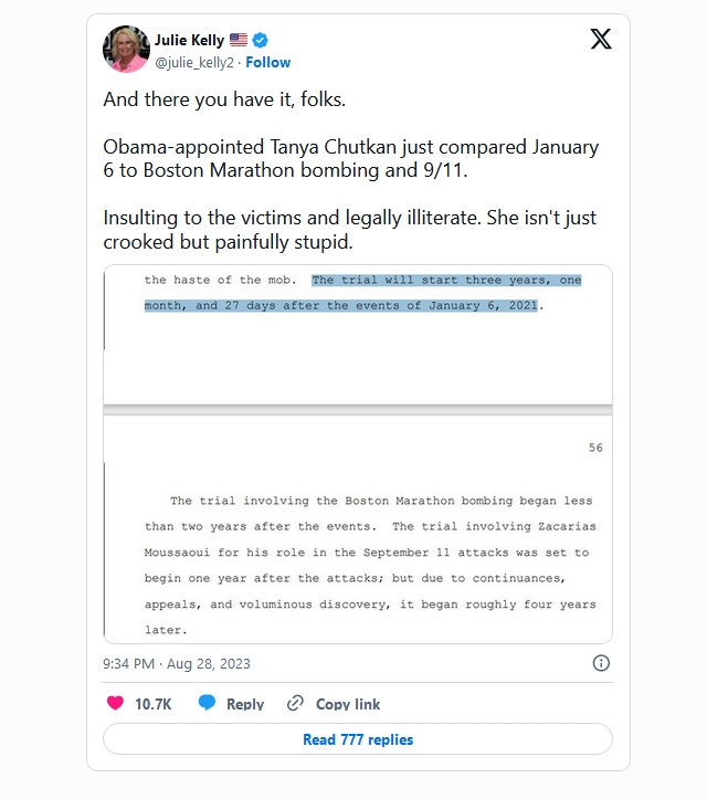 U.S. District Judge Tanya S. Chutkan, who is overseeing Trump's indictment from January 6, has reportedly drawn comparisons between the Capitol riots and the 9/11 terrorist attacks as well as the Boston Marathon bombing. These comparisons emerged during a courtroom session where she questioned the necessity of a lengthy trial delay for a defendant charged with participating in the January 6 events. These remarks were relayed by journalist Julie Kelly, who has been covering the trials of those implicated in the January 6 riot through her Substack publication, "Declassified with Julie Kelly." Judge Chutkan highlighted that the trial for the January 6 defendant would commence "three years, one month, and 27 days" after the events of January 6, 2021. She juxtaposed this timeline with the commencement of other high-profile trials: "The trial concerning the Boston Marathon bombing initiated less than two years after the events. The trial involving Zacarias Moussaoui for his role in the September 11 attacks was set to begin one year after the attacks; however, due to continuances, appeals, and extensive discovery, it began roughly four years later." While the January 6 riot undoubtedly left its mark on American history, equating it to events that resulted in the loss of nearly 3,000 lives and catalyzed a worldwide war on terror is viewed by many as an inappropriate analogy. When a judge makes a comparison that numerous people perceive as a stretch, it raises concerns about impartiality and the potential for bias. The judicial system's role is to apply the law justly and without partiality. Recently, Chutkan established the trial date for Trump's alleged interference in the 2020 presidential election as March 4, 2024. This timing positions the trial squarely within the GOP presidential primary calendar. The trial's schedule, coinciding with the heart of the primary season, is expected to draw continued intense political attention from Republicans. Notably, the trial's commencement falls just a day before a pivotal event in the Republican nomination process: Super Tuesday. Judge Chutkan's ruling follows Special Counsel Jack Smith's investigation into Trump's potential involvement in the January 6, 2021 Capitol riot and alleged meddling in the 2020 election outcome. On August 1, Trump faced four federal indictments stemming from Smith's January 6 inquiry. These charges encompass conspiring to defraud the United States, plotting to obstruct an official proceeding, obstructing and attempting to obstruct an official process, and conspiracy against rights. Trump vehemently denied all allegations, asserting his innocence. Initially, Trump's defense team proposed a trial start date in April 2026, well after the results of the 2024 presidential election would be determined. Nevertheless, Judge Chutkan firmly rejected this request, stating, "I can tell you right now you are not getting two years. This case is not going to trial in 2026." "I don't doubt for a minute that you have been working diligently, but you and I have a very different estimate of what time is needed to prepare for this case," Chutkan remarked. "Discovery in 2023 is not sitting with boxes in a warehouse... We both know the first cut is reviewed by electronic searches," Chutkan continued, underscoring that "no one's sitting there going page by page." Keep reading with a 7-day free trialSubscribe to John’s Substack to keep reading this post and get 7 days of free access to the full post archives.A subscription gets you:
