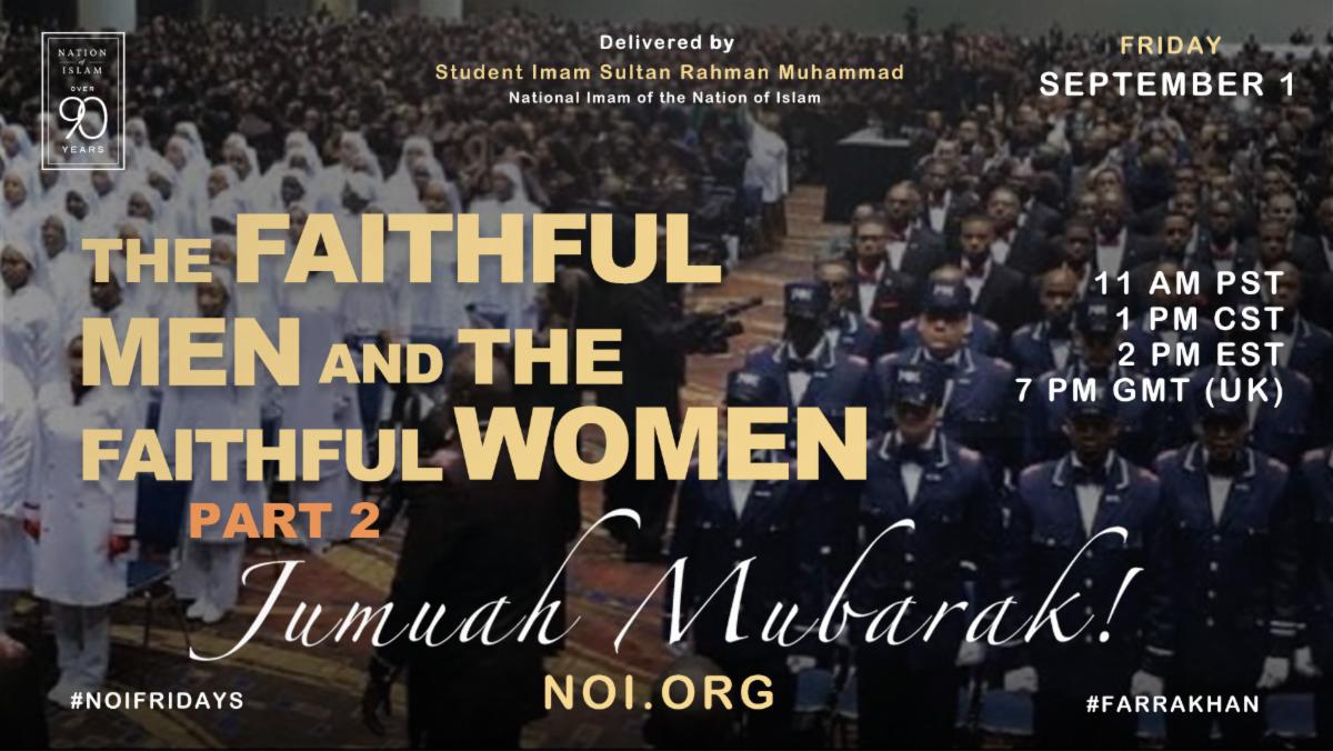 Join us tomorrow at 1 pm for Jumuah Prayer Service- 'The Faithful Men And The Faithful Women Part 2' delivered by Student Imam Sultan Rahman Muhammad, National Imam of The Nation of Islam.