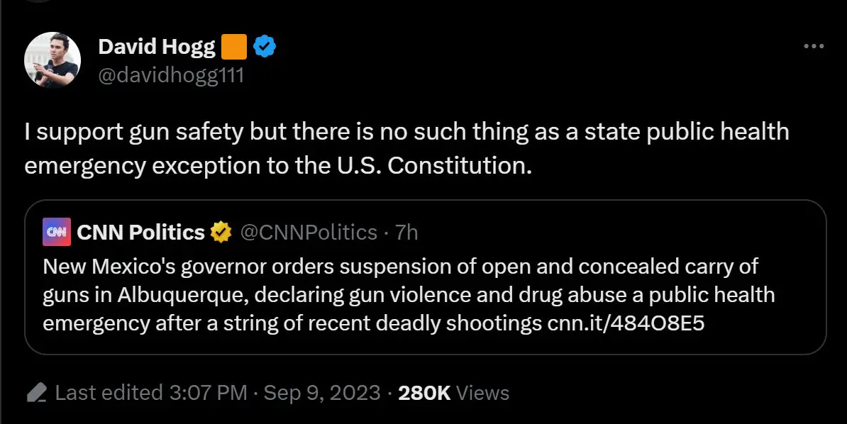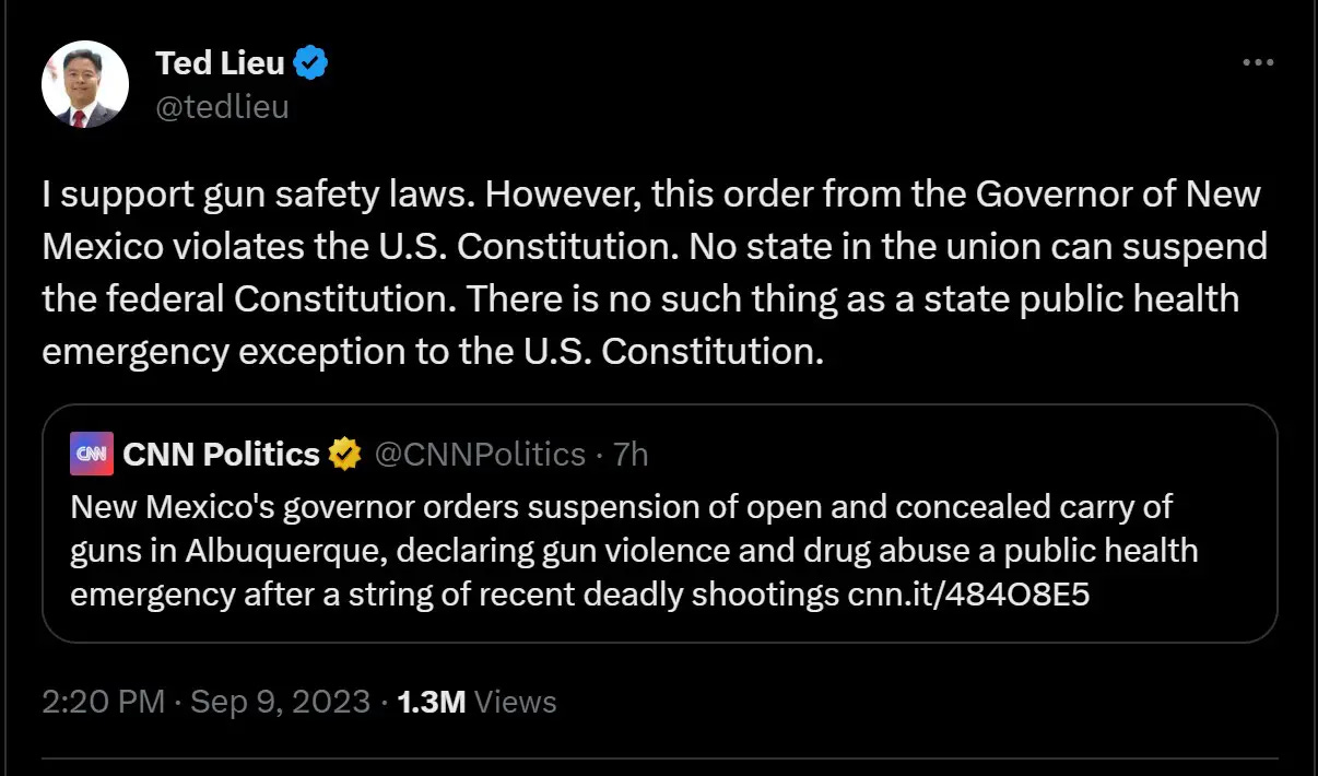 Congressman Lieu might have overlooked the government's response to the Covid pandemic. "If this is not definitive proof [Grisham] has gone too far, no such proof can ever exist," attorney and podcaster Viva Frei noted. "And David, I hope you appreciate that this correct observation applies not only to this egregious overreach, but to the government Covid response as a whole," he added. "The government's thirst for total control is not limited to any one specific Amendment." But there were others who didn't trust the counter-messaging. "DNC must have sent out the memo to release the 'I SUPPORT GUN SAFETY BUT…' tweets," one user remarked. One commentator, T.J. Moe of The Blaze, argued that these gun control activists have ulterior motives for speaking out against Grisham's unconstitutional order. "This is a Psy op," he claimed, referring to the slang for 'Psychological Operation.' "They set this up so that guys like Ted Lieu and David Hogg, the most insane leftists, could march out and appear to be reasonable and in favor of upholding the constitution. They are not. Don't fall for the psy op. These people are not reasonable or your friend." California Governor Gavin Newsom, a potential 2024 candidate, may have given the game away with a subsequent tweet. "Not only has Congress stalled for YEARS on passing common sense reforms — judges across the country are tearing down laws that Americans overwhelmingly support," he claimed. "Laws that keep us SAFE and keep guns out of the hands of dangerous criminals." Newsom, however, is being deceptive: Criminals don't adhere to gun-control laws, and such laws disarm law-abiding citizens and criminals. That is precisely why Governor Grisham's order will almost certainly be found unconstitutional. Now, New Mexico State Representatives Stefani Lord and John Block are calling for the impeachment of New Mexico Governor Michelle Grisham. "I am calling on counsel to begin the impeachment process against Governor Grisham," said Rep. Stefani Lord. "This is an abhorrent attempt at imposing a radical, progressive agenda on an unwilling populace." Keep reading with a 7-day free trialSubscribe to PatriotNewsToday to keep reading this post and get 7 days of free access to the full post archives.A subscription gets you:
