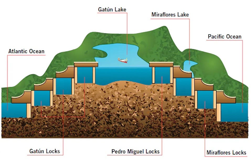 Panama Drought Creates Global Traffic JamSustained congestion at the Panama Canal could ripple through global supply chainsLast week, I had the opportunity to visit the Panama Canal, one of the most strategic waterways in the Western Hemisphere. It sits at the literal crossroads of North and South America as well as the Pacific and Atlantic oceans. A meaningful percentage of global trade, worth approximately $270 billion, transits the isthmus in Central America each day. In 2022, more than 14,000 vessels went through the canal, most of which were container ships carrying goods between Asia and the American east coast or Europe. And the strategic value of the Panama Canal is substantial, allowing for rapid naval movements that would otherwise be hampered by a lengthy journey around the southern tip of South America. The economic and strategic value of a waterway connecting the Atlantic and Pacific oceans motivated potential canal builders going back as far back as the 1500s when the Spanish Crown sought to unite both seas. The French made numerous attempts to build a canal in the 1800s, but as the century came to an end, so too did their funding. Further, most attempts to construct the canal led to debilitating disease and illness among the workers. That’s when America was persuaded to abandon a waterway connecting the oceans through Nicaragua. But when Colombia failed to ratify the treaty granting a ten-mile wide stretch across the isthmus to the United States for the construction of a canal, US President Teddy Roosevelt supported Panama’s independence from Colombia in 1903, and secured the future of the Panama Canal. Turns out that the key challenge in constructing the canal was worker health, specifically yellow fever and malaria. And it was American doctors that solved the problem by focusing on controlling disease-carrying mosquitos. By 1914, the canal was completed and on August 14th of that year, the Ancon successful navigated the interoceanic waterway that was owned, controlled, and managed by the United States. Over the next few decades, tensions rose as Panamanians sought a modification of the treaty that granted sovereignty over the Canal Zone to America. These efforts culminated in US President Jimmy Carter agreeing to give full ownership and control of the canal and surrounding lands to Panama in 1999. The canal is an engineering marvel that enables gigantic ships containing vehicles, petroleum products, bulk commodities, and cruise passengers to rise 26 meters (~85 feet) above sea level in order to cross between the oceans. The design of the canal involved creating a manmade lake at the highest point, which allows gravity to move water into the locks as needed. During my visit to the Miraflores Locks, I watched a gigantic oil tanker get lifted by 26 million gallons of water that flowed in its chamber in about 10 minutes. And here's the part I found fascinating: not one pump is used to move even a drop of water. Gravity does all the work. But as you can see on the schematic above, this is only possible because of the water held in Gatun Lake. On average, each ship that passes through the canal results in 55 million gallons of water being flushed out to sea. Each day, the canal uses three times the water used by New York City. One of the concerns I’ve had for a few years (See #6 on my list of global predictions for 2022-2027) is that canal operations are at risk of disruption if Panama suffers a drought. Unfortunately, that’s exactly what’s happened. Leaders at the Panama Canal Authority are restricting ship weights and reducing the number of daily crossings in a quest to conserve water. As a result, there’s now a traffic jam of vessels waiting to enter the canal. The congestion is now causing ripples throughout global supply chains. A recent Reuters report summarized the issue and its impact: Ship owners are getting so desperate that some are paying millions to avoid the congestion. According to Business Insider, “a $2.4 million price tag was the winning bid for an auction held by the canal authorities for vessels to secure slots to sail through the waterway.” Of course, insufficient water is not the only potential risk to the Panama Canal. In 2010, extraordinarily heavy rains caused Gatun Lake to overflow and the flooding that followed forced a closure of the canal as the locks were inundated. And as we saw in 2021, it’s also possible for a ship to get stuck in the canal. In March of that year, the Suez Canal was blocked for six days by the Ever Given, a massive container ship. A mere five days after its grounding, the traffic jam had more than 369 vessels queuing to pass through the canal, holding up about $10 billion worth of goods each day, in a passageway that regularly handles more than 10% of global trade each day. (Incidentally, a year after this happened, the Ever Forward grounded itself in Chesapeake Bay.) There’s also the obvious military risk associated with strategic bottlenecks. In 1967, the Suez Canal was blocked by Egyptian forces at the onset of the Six-Day War and remain closed until after the Yom Kippur War. It wasn’t until after US and British minesweepers cleared the Suez Canal in 1974 that Egypt reopened the canal. Given the strategic importance of the Panama Canal, it’s noteworthy that the commander of the Islamic Republic of Iran’s navy, Rear Admiral Shahram Irani, stated bluntly “We are planning to be present in the Panama Canal” in January of this year. The Islamic regime, one of the world’s most extreme sponsors of terror, then sent two warships to the Western hemisphere, the Dena and the Makran. According to the Tehran Times, “Dena is a Mowj-class warship that...is outfitted with anti-ship cruise missiles, torpedoes and naval cannons. Makran, a forward base ship weighing 121,000 tons, is…used to support the combat vessels logistically and can carry five helicopters.” The drought in Panama and security risks are