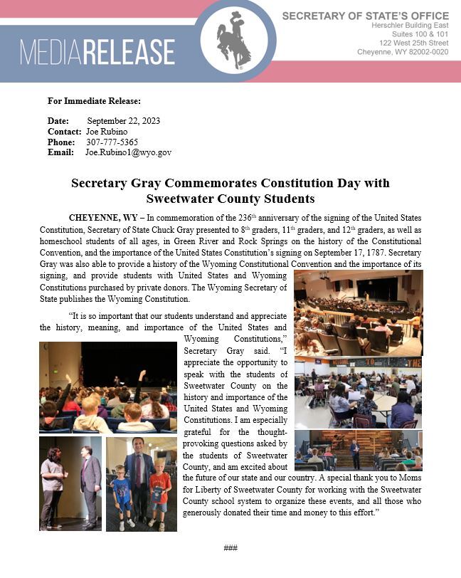 | Secretary Gray Commemorates Constitution Day with Sweetwater County Students |