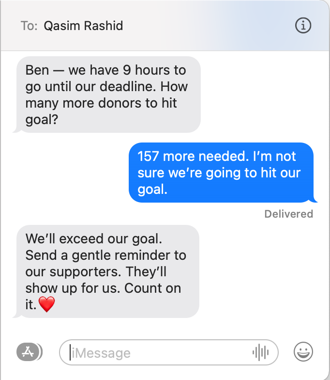 We're still about 150 donors short of our end of quarter goal. It's getting down to the wire, but Qasim is keeping the faith: