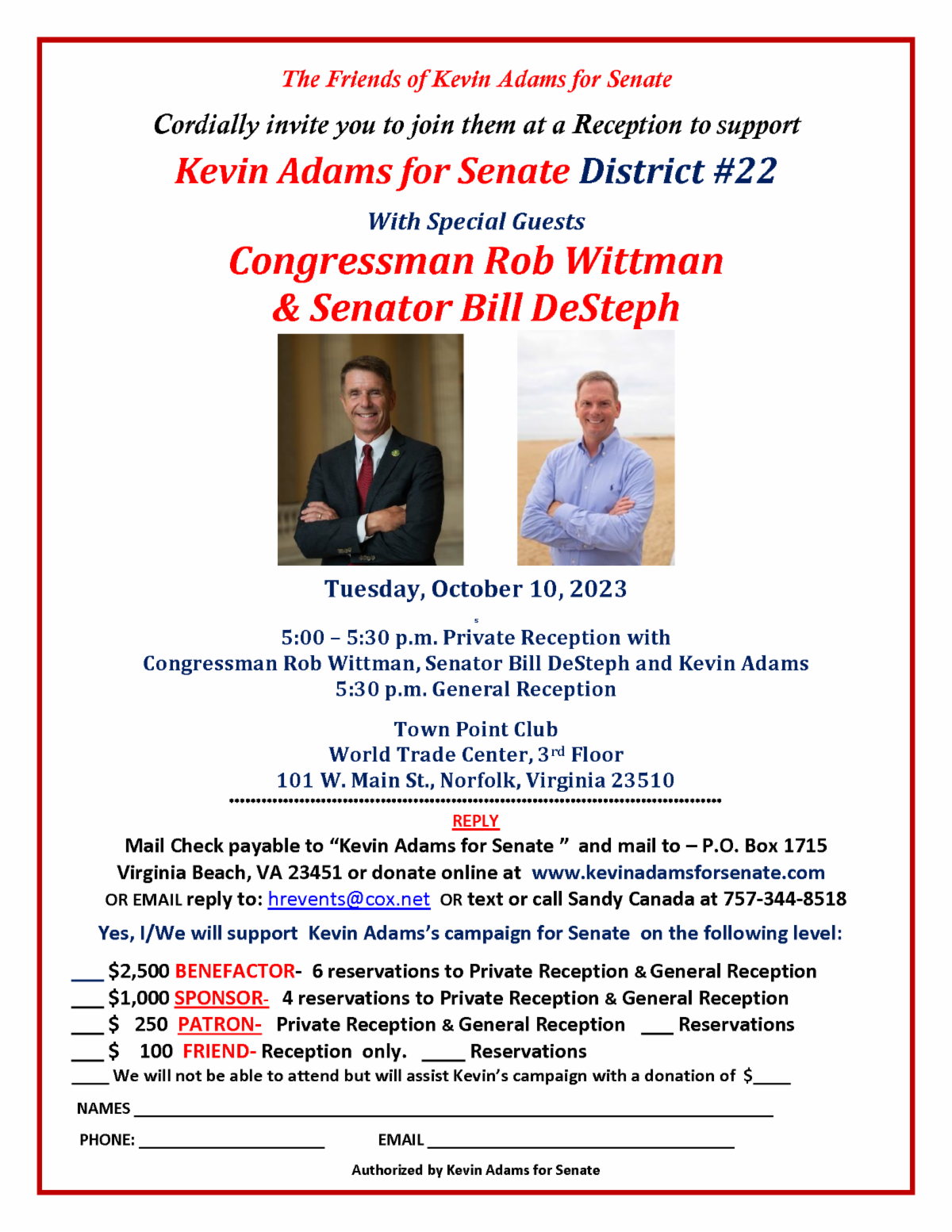 Please join Congressman Rob Wittman and me next week (Tuesday, October 10th) for a reception at Norfolk's Town Point Club in support of our friend, Kevin Adams.