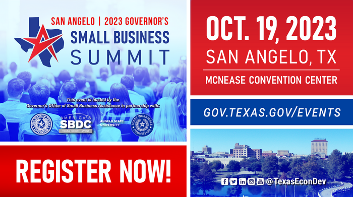 The Governor's Small Business Summit — San Angelo aims to help Texas small business owners and aspiring entrepreneurs reach new heights by connecting them with the resources and information needed to start, strengthen and grow a business. This event offers a variety of sessions bringing together local, state and federal resource partners to provide key insights on critical business topics. It's also an opportunity to network with other business owners and meet experts who will share timely, relevant and actionable advice on a multitude of small business subjects.