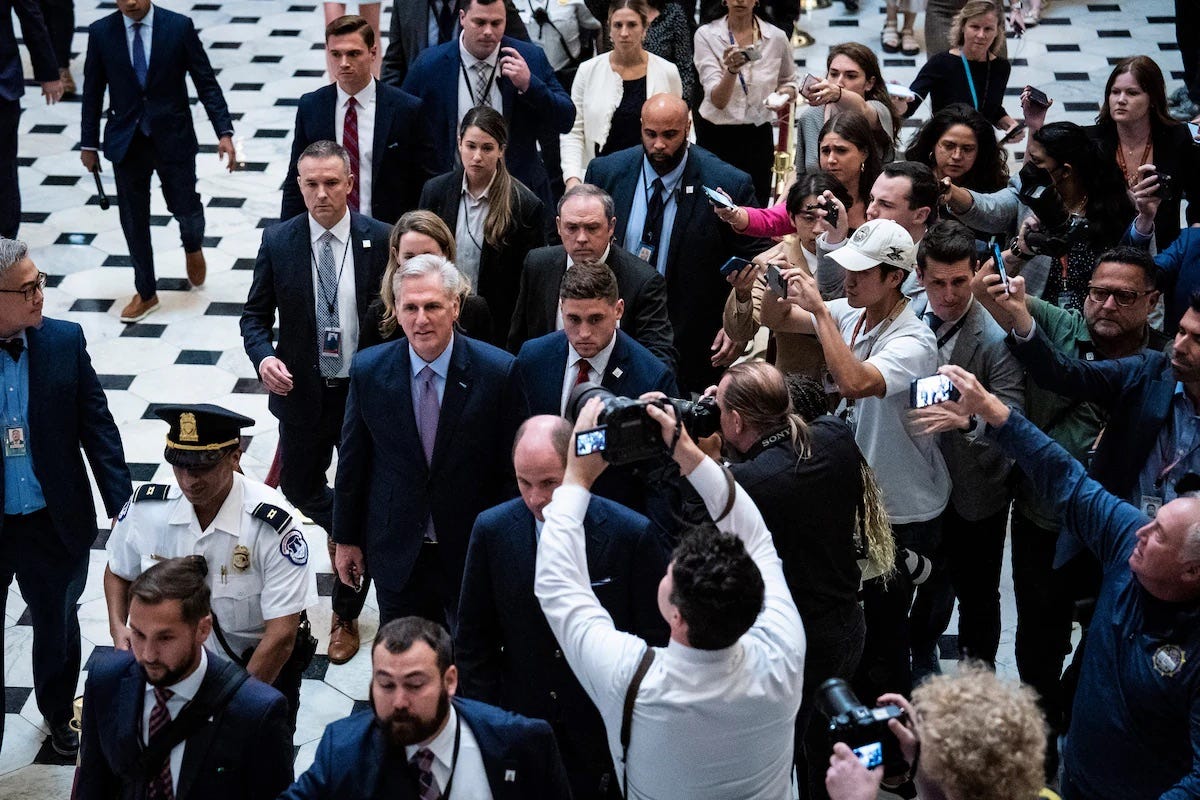 No one feels sorry for Kevin McCarthy right now. His dogged ambition to become Speaker of the House led him to cut the very deal with MAGA extremists back in January that led to his own downfall this week. He made history twice in the process, by being elected only after the most rounds of voting in 160 years (15 ballots!), and by being the first Speaker removed from office. So McCarthy truly made his own ignominious bed. Unfortunately, we all have to lie in it. Who’s up next? Speaker Scalise? Much worse, Speaker Jordan? Or unthinkably, Speaker Trump? That last one isn’t likely, though it has been floated. The speaker choices exemplify the problem with MAGA: There are no good options. McCarthy faced a similar dilemma last weekend. He could let the government shutdown proceed, as his MAGA colleagues wanted. Or, he could risk his position to keep the government open for another 45 days. McCarthy has done a lot of less-than-stellar things, but ultimately, he was ousted from his coveted speakership for…striking a short-term deal with Democrats to avert a shutdown. Yes, it serves him right. But more ominously, it tells us everything we need to know about MAGA—bipartisan governing, even for the sake of the public good, will not be tolerated. —The Mission: Democracy Team Commotion to vacateIt’s been four chaotic days since MAGA Republicans in Congress forced Rep. Kevin McCarthy out of the speakership, and just slightly less since Republicans blamed Democrats for it. Now, the battle is on to take over the gavel. Leading the pack is MAGA Rep. Jim Jordan, who has earned the coveted endorsement of one Donald Trump. Though Trump himself has been nominated for the role, he has said he would only accept it temporarily “if necessary.” Plans for a televised Fox News forum with the Speaker contenders next week have reportedly fallen apart, but Trump intends to visit the Capitol on Tuesday to meet with House Republicans about the decision. Talk about returning to the scene of the crime. Meanwhile, former Republican congresswoman Liz Cheney isn’t mincing words about Jordan. “Jim Jordan knew more about what Donald Trump had planned for Jan. 6 than any other member of the House of Representatives,” she said. “Jim Jordan was involved, was part of the conspiracy in which Donald Trump was engaged as he attempted to overturn the election.” While she doesn’t expect Jordan to win the speakership, Cheney warned, “If they were to decide that, there would no longer be any possible way to argue that a group of elected Republicans could be counted on to defend the Constitution.” Stay tuned.
