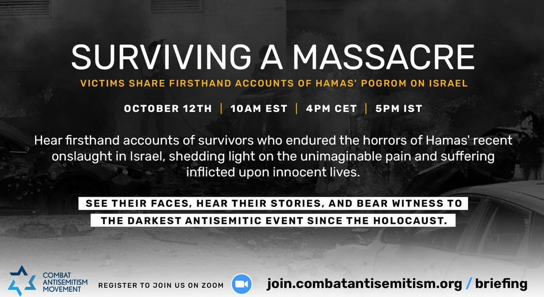 I thought it important to share this powerful program the Combat Antisemitism Movement (CAM) is presenting tomorrow, Thursday morning, October 12 at 10AM Eastern: an opportunity to hear from survivors who experienced the horrors of Hamas' recent onslaught in Israel.