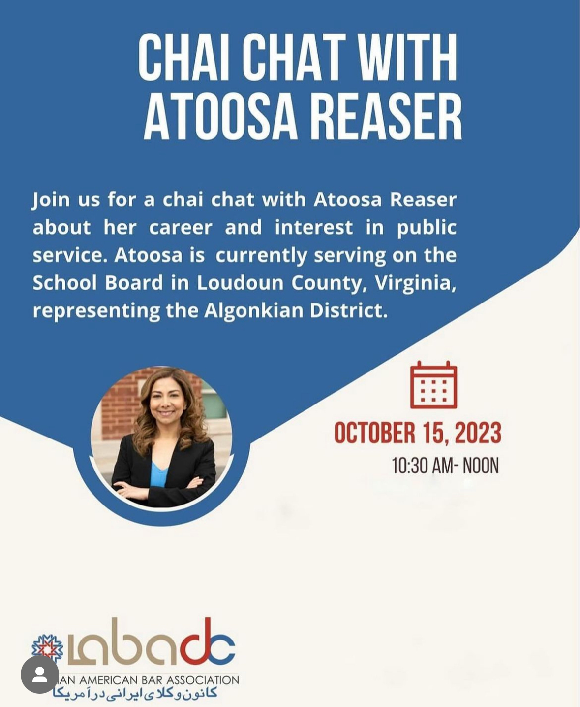 SUNDAY, OCTOBER 15th, 10:30 AM-12:00 PM Hosted by the Iranian-American Bar Association Come grab a cup of your favorite morning drink and hear about my career as an attorney and how it has lead me into public service. Location will be provided after registration but in Sterling, VA. |