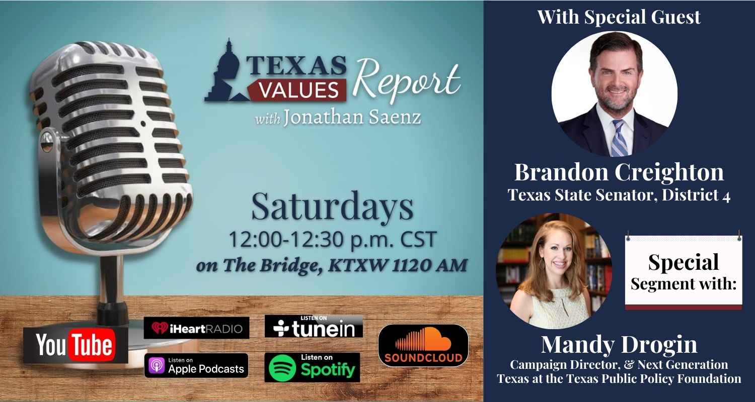 Texas Values Report with guest Senator Brandon Creighton Special Segment with Mandy Drogin, Campaign Director, Next Generation Texas, Texas Public Policy Foundation is our Special Guest on the Texas Values Report! |