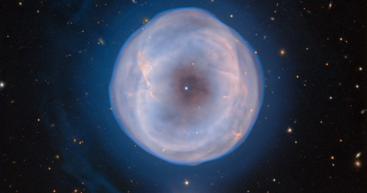 S30Gaze Into This Ethereal Nebula and Glimpse Our Solar System's Future   Captured by Chile’s Gemini South Telescope, this Spare Tire Nebula looks more like a crystal ball to us.Some 3,000 light years away, shimmering layers of gas formed an almost perfect sphere around the faintly glowing, burned-out core of a dead star. The result looks like a giant crystal ball floating in space — and if you stare into it too long, you can almost see a giant cosmic eye staring back. Don’t be fooled by the serene beauty of this image, as those diaphanous clouds of gas are roaring outward at around 112,000 miles an hour.
