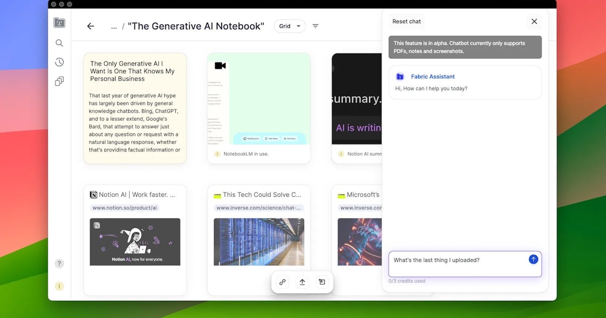 S36The Only Generative AI I Want Is One Trained On My Personal Life   Services like Google's NotebookLM and Fabric are building AI experiences around analyzing your links, files, and personal notes.That last year of AI hype has largely been driven by the allure of general knowledge chatbots. Experiments masquerading as services called Microsoft Bing, ChatGPT, and to a lesser extent, Google Bard, that attempt to answer just about any question or request with a natural language response, whether that's providing factual information you might dig up in a search through Google, or generating entirely “new” text.