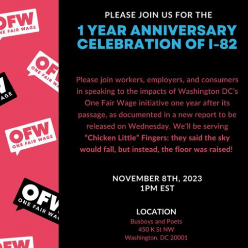 They said the sky would fall, but instead the floor was raised! One year ago this week DC voters passed Initiative 82 to phase out the tipped minimum wage. Today at 1:00 PM Metro Washington Council president Dyana Forester will join One Fair Wage for a panel discussion about the landmark ballot measure and where restaurant workers stand today in the process of earning DC's full minimum wage. Register to attend.