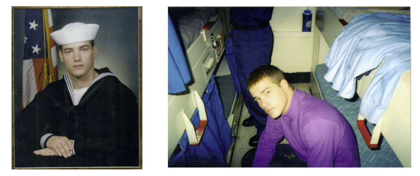 (Left) A younger me in my Navy dress uniform. (Right) Me below deck in my re-fueler uniform. We wore purple uniforms to signify our role as re-fuelers.