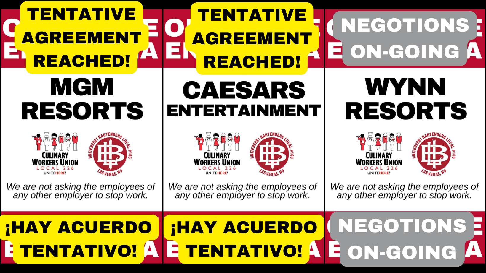 ACTUALIZACIÓN DEL CONTRATO: Después de 2 días de negociaciones consecutivas, la Unión Culinaria se complace en anunciar que se ha alcanzado un acuerdo tentativo para un nuevo contrato de 5 años con Caesars Entertainment y MGM Resorts, respectivamente, para aproximadamente 30.000 trabajadores de la hospitalidad en 17 propiedades de Las Vegas.