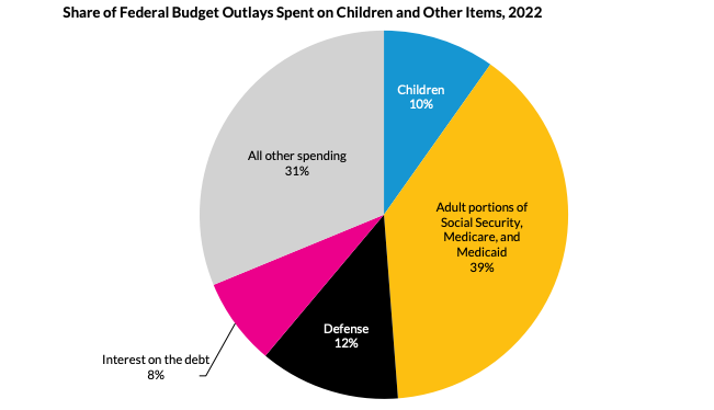 As a share of federal outlays (excluding tax subsidies), the $609 billion invested in children in 2022 was 10 percent of all federal outlays. Under laws in place as of March 30, 2023, the children’s share of federal outlays is projected to decline to 6.2 percent over the next decade as budgetary pressure from growing entitlement spending on adults, higher interest costs, and shortfalls in revenues relative to outlays threaten to crowd out other priorities.