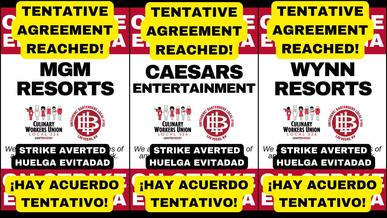 STRIKE AVERTED: The Culinary and Bartenders Unions are pleased to announce that a tentative agreement for a new groundbreaking five-year contract was reached with Wynn Resorts covering over 5,000 hospitality workers at Wynn & Encore Las Vegas less than 3 hours before the strike deadline.