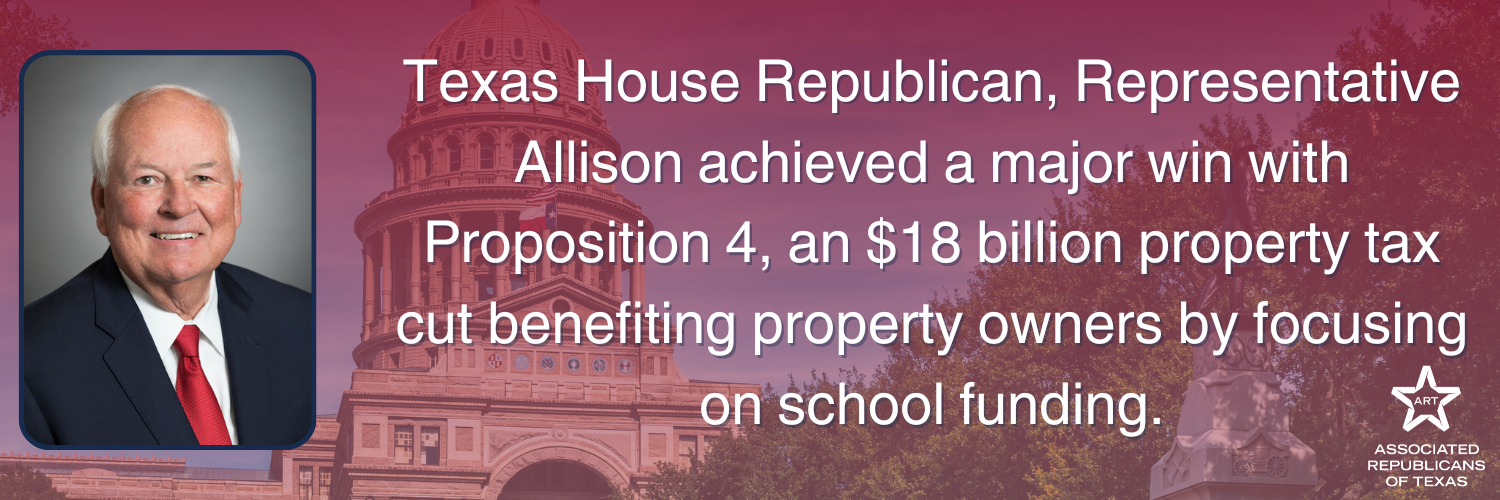 Proposition 4 was on the ballot because Texas House Republicans, including Rep. Allison, voted earlier this year to present this constitutional amendment to the voters. It was designed to bring much-needed property tax relief. This $18 billion property tax-cut will result in a significant reduction of property owners' tax bills.