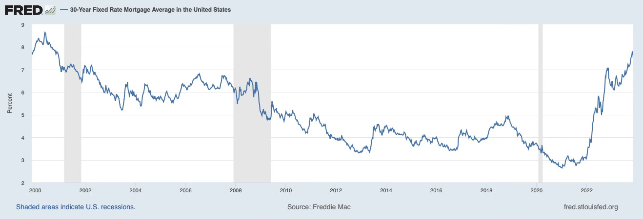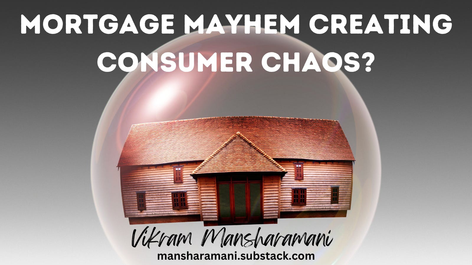 Mortgage Mayhem Creating Consumer Chaos?How will the surge in mortgage rates impact home prices, consumer spending, and the trajectory of the economy?In a quest to control inflation in the US economy, the Federal Reserve Bank has raised interest rates to levels not seen in decades. As a result, mortgage rates have also surged, creating pressures that will almost certainly impact real estate prices. The average 30 year fixed mortgage rate hit 8% before recently falling slightly. To put this in context, that rate was below 3% in the fall of 2021 as seen in the chart below.