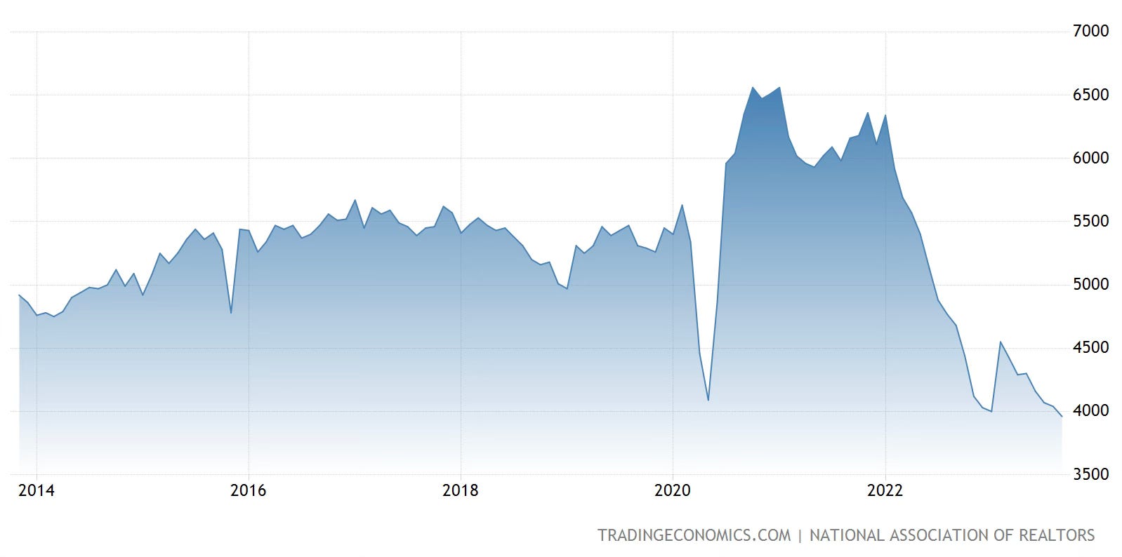 And because most home buyers use financing to buy their properties, mortgage rates have an impact on home prices. To get a sense of the potential impact, let’s consider a simple example. Let's say a young couple saves $100,000 to use as a downpayment to purchase a home. In October 2021, they buy a home for $500,000 using their savings and a $400,000 mortgage (30 year fixed for 3%), which obligates them to a payment of around $1700 per month. Now suppose they were trying to buy a home today. With 8% rates, their monthly payment on a $400,000 mortgage would be slightly less than $3500 per month, more than double their payment at 3%. This increase in monthly payment might keep the home purchase out of reach until the couple either saved more money or was able to afford the higher monthly payment. Bottom line, all else equal, higher rates reduce demand for housing. An alternative analysis, however, can yield substantial insights into the magnitude of a potential housing price correction. How large a mortgage could the couple afford if they were willing to pay the same monthly payment? Assuming a 30 year fixed mortgage at 8%, and a monthly payment of $1686.42 (the exact monthly payment for a 30 year, 3% mortgage of $400,000), the amount they could borrow would be less than $230,000, meaning they could purchase the home for $330,000. Simply put, this fixed budget analysis implies a house price drop of 34% since 2021. So does this mean that prices would fall by a third? Probably not, because the couple might increase their housing budget by reducing their spending on other items, enabling them to offer more than $330,000. Alternatively, they might also use the higher cost of living to negotiate higher wages, enabling higher payments and a higher offer price. Regardless of the magnitude, it seems clear that, all else equal, demand for housing at a particular price drops as mortgage rates climb. This is, in fact, exactly what we see in the data. Late last month, the Wall Street Journal noted the mortgage market was suffering one of its worst busts ever. The article noted how one of the leading mortgage companies, Guaranteed Rate, was asking employees to return signing bonuses less than two years after hiring them as mortgage activity has hit its lowest level in nearly 30 years. The Bureau of Labor Statistics has pointed out that the mortgage industry has already shed more than 80,000 jobs and the Mortgage Bankers Association anticipates another 40,000 losses. Unsurprisingly, existing home sales have plunged to a level not seen since the Global Financial Crisis.