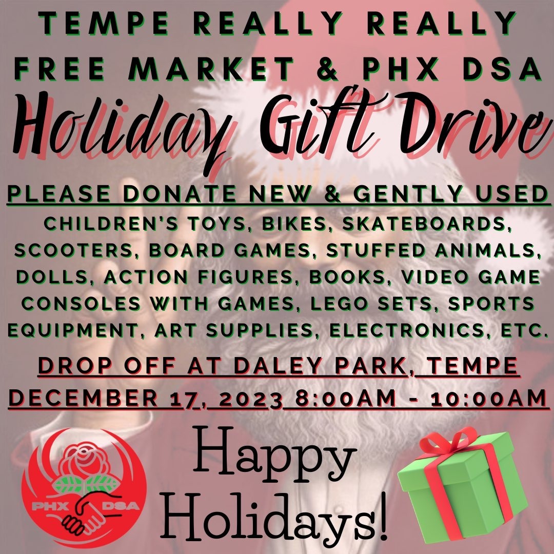 Phoenix DSA's mutual aid committee is Holding a Holiday Gift Drive! Please contact us for drop off locations or join us on December 17 from 8-10am for Tempe Really Really Free Market (located at Daley Park in Tempe) where we will be accepting donations at our table. If you can't attend or drop off a gift, but you'd like to contribute, please make a donation to Phoenix DSA's mutual aid fund! Gifts will be given out to the children of Tempe Really Really Free Market attendees, delivered to shelters, and donated to community members experiencing need under capitalism.