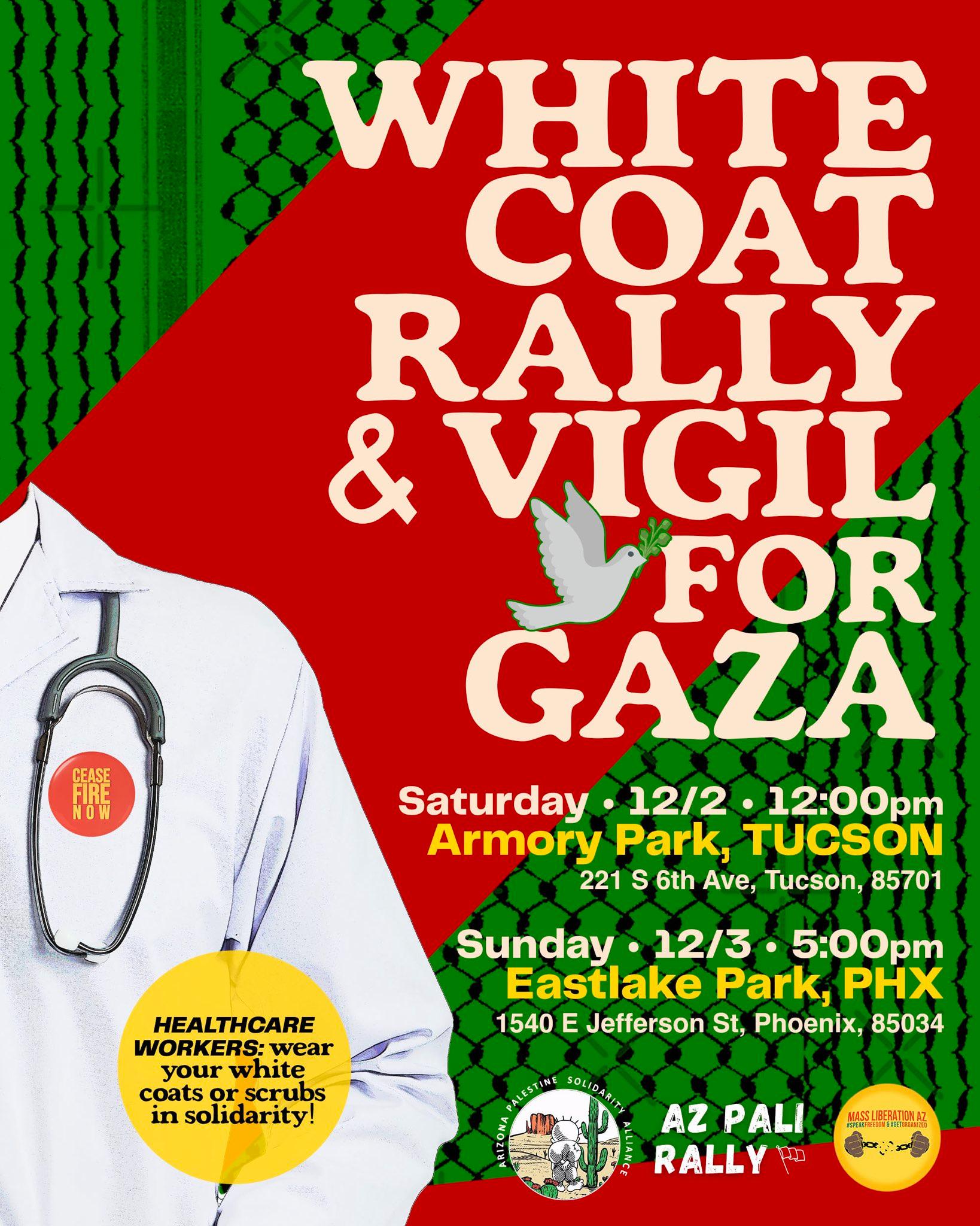 Join Phoenix DSA members at a white coat rally and vigil organized by Mass Liberation AZ, AZ Pali Rally, and the Arizona Palestine Solidarity Alliance on Sunday, December 3, at 5:00pm in Phoenix's Eastlake Park (1540 E Jefferson Street, Phoenix, 85034).