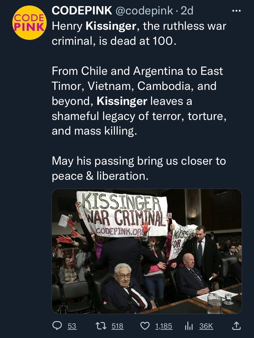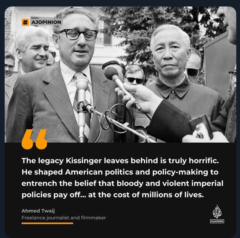 If his genocidal machinations, lies in public to cover them up, and lifelong unaccountability were not bad enough, Kissinger also overtly disrespected U.S. service members, many of them are compelled by what amounts to a “poverty draft” to risk their lives to serve American imperialism. His reprehensible comments included this gem: “Military men are just dumb, stupid animals to be used as pawns in foreign policy.” It is one thing to murder millions, lie about it and one’s own values, and to live out a long life in impunity. Insulting the people on whose backs (and graves) he built his legacy reveals just how disgusting, depraved, and deplorable Henry Kissinger was. Humanity could breathe a sigh of relief at his death, had Kissinger’s life not done so much to ensure death, destruction, and the decline of democracies around the world. Paid subscribers can gain access to a collection of comedy sketches and memes that addressed Kissinger’s legacy more thoughtfully than most American corporate news outlets. The man’s left a hateful and revolting legacy, and since justice for his crimes remained lacking during his life, he deserves relentless ridicule in death... Keep reading with a 7-day free trialSubscribe to Shahid’s Thoughts to keep reading this post and get 7 days of free access to the full post archives. A subscription gets you: