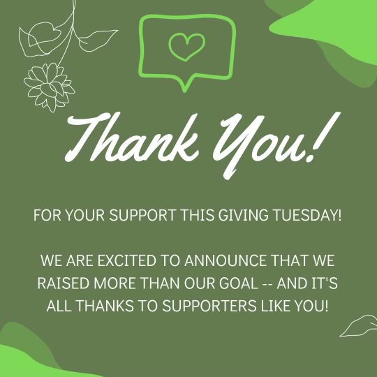 Thank you so much, from the bottom of our hearts, for your support this last Giving Tuesday. We are excited to announce that we raised MORE than our goal -- and it's all thanks to supporters like you.
