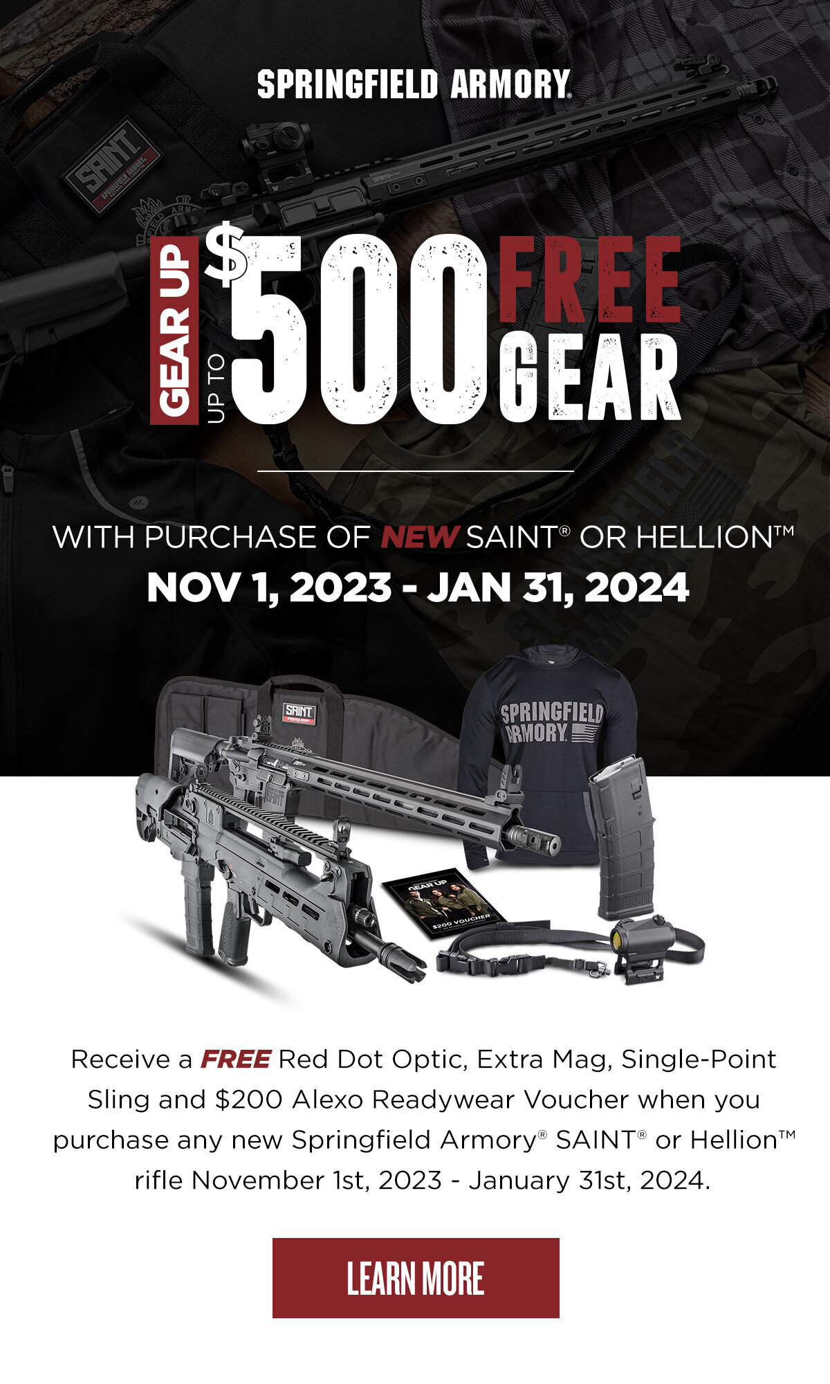 Receive a FREE Red Dot Optic, Extra Mag, Single-Point Sling and $200 Alexo Readywear Voucher when you purchase any new Springfield Armory® SAINT® or Hellion™ rifle November 1st, 2023 - January 31st, 2024.