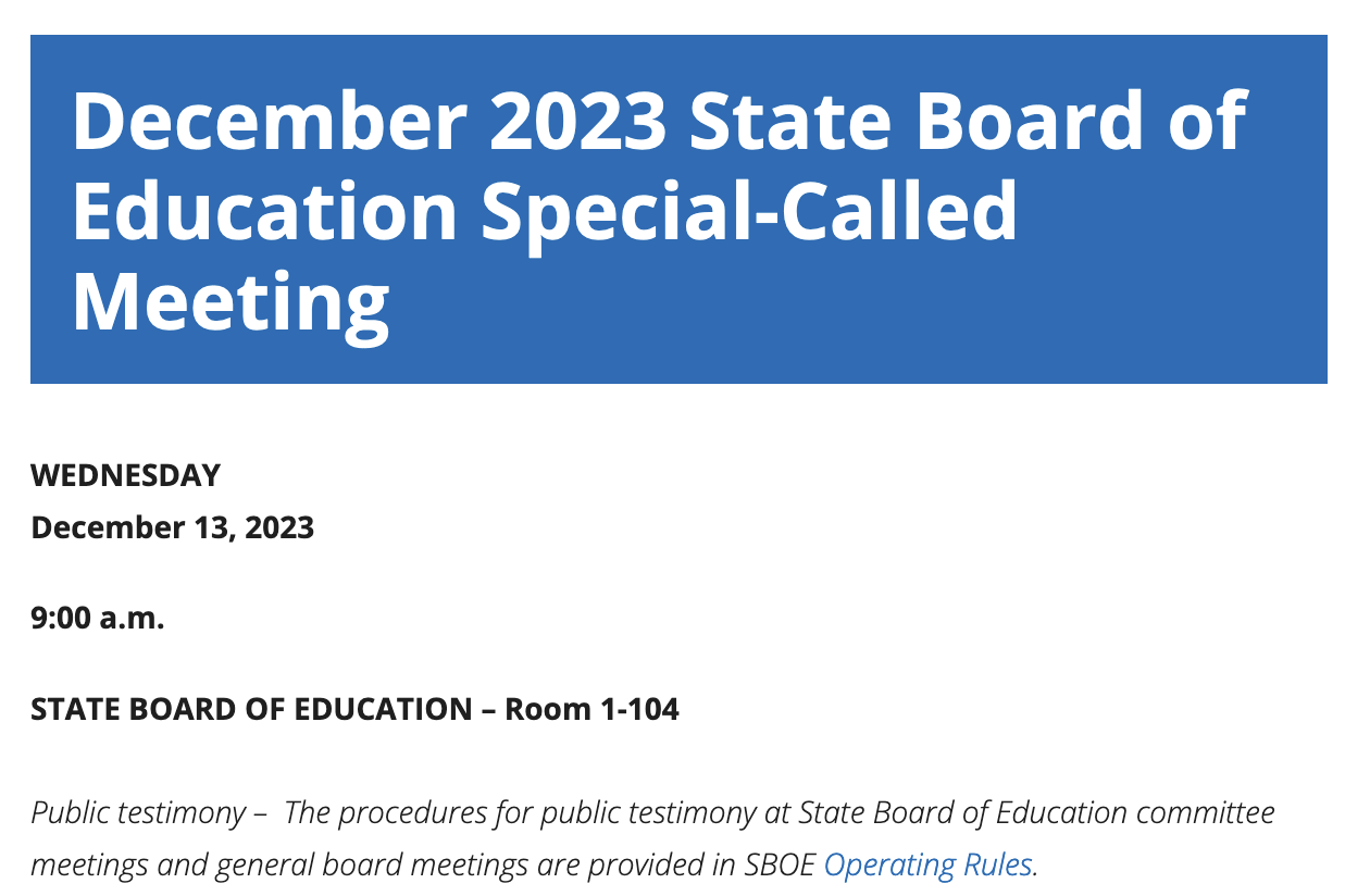 The Texas State Board of Education is having a special meeting next week on December 13, to discuss standards for classroom instructional materials in alignment with new law HB 1605 and library book standards for new law HB 900.