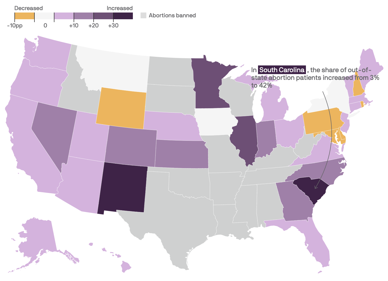 Why it matters: The report, released Thursday by the Guttmacher Institute, is the latest indicator of how the 2022 U.S. Supreme Court's decision overturning Roe v. Wade is reshaping abortion access