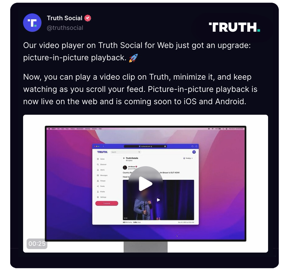 Our video player on Truth Social for Web just got an upgrade: picture-in-picture playback.