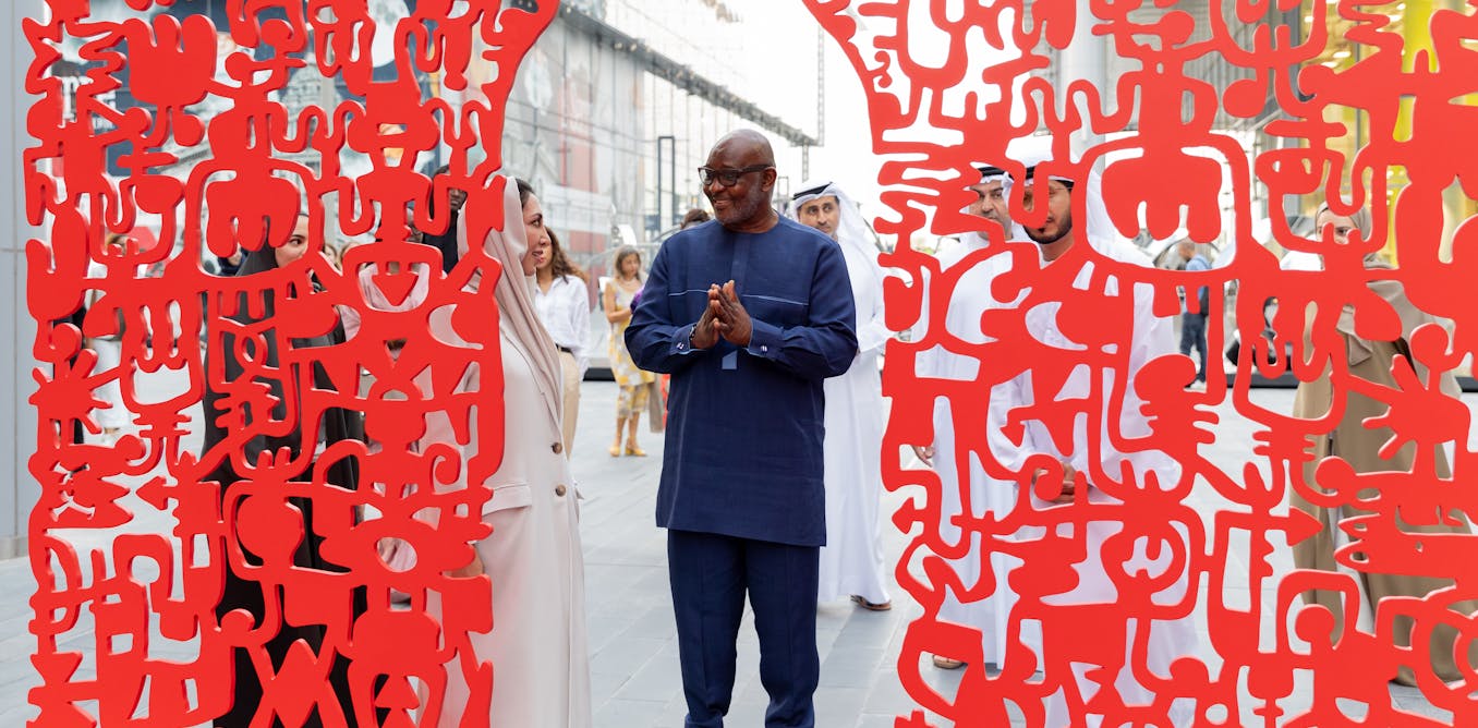 S56Victor Ekpuk is a Nigerian artist who uses ancient African graphic writing systems to unveil a stunning new display of creativity   Victor Ekpuk is an internationally renowned Nigerian artist known for his artwork inspired by ancient African writing and graphic writing systems. INTERwoven TEXTures is his first solo exhibition at the important Efiɛ gallery in Dubai in the United Arab Emirates. There he has also unveiled his public art installation commissioned as part of the inaugural Dubai Calligraphy Biennale. It makes him the first African artist to display a public sculpture in the country.Exploring “traditional” graphic writing forms along with his own style of abstraction, Ekpuk creates a new text. One that reflects both historical and contemporary Africa, yet also reaches beyond the continent. His latest exhibition represents a powerful intervention. In his own words: