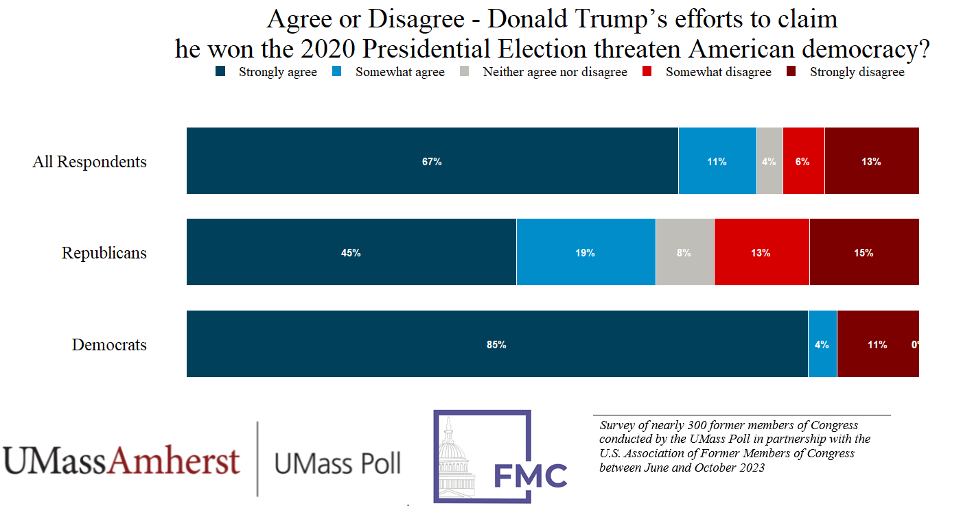 UMass Poll surveyed 237 former members of Congress from June to October of this year. When asked if they agree with the statement, "Donald Trump's efforts to claim he won the 2020 Presidential Election threaten American democracy," the vast majority agreed. Sixty-seven percent strongly agreed and another 11 percent answered "somewhat agree."