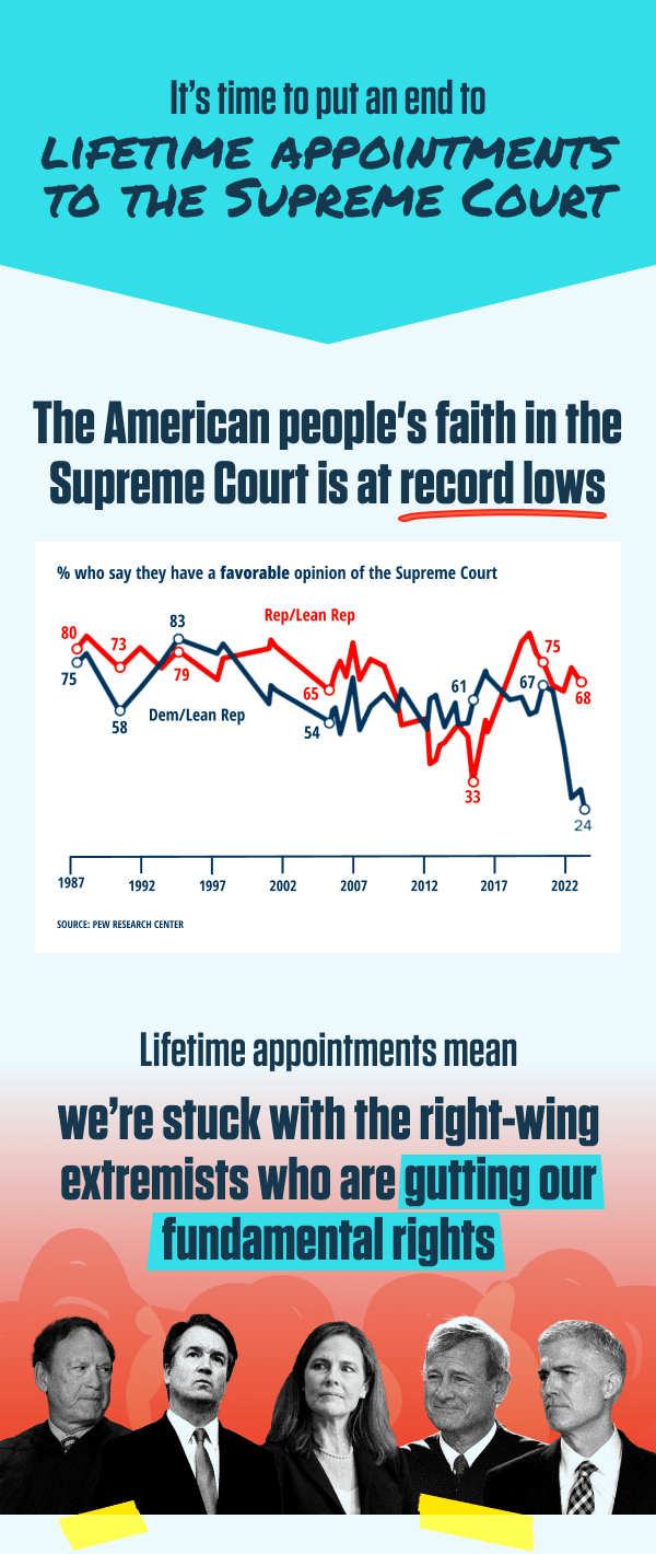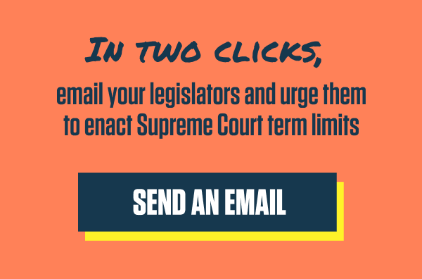 It's time to put an end to lifetime appointments to the Supreme Court. The American peoples faith in the Supreme Court is at record lows. Lifetime appointments mean we're stuck with the right-wind extremists who are gutting our fundamental rights. One way Congress can restore balance to the Court? Passing 18-year term limits for justices. With term limits, Clarence Thomas—who has been siding with billionaires for over 30 years—would be the first to go. 7 out of 10 Americans support passing term limits. Are you one of them? In two clicks, email your legislators and urge them to enact Supreme Court term limits. SEND AN EMAIL