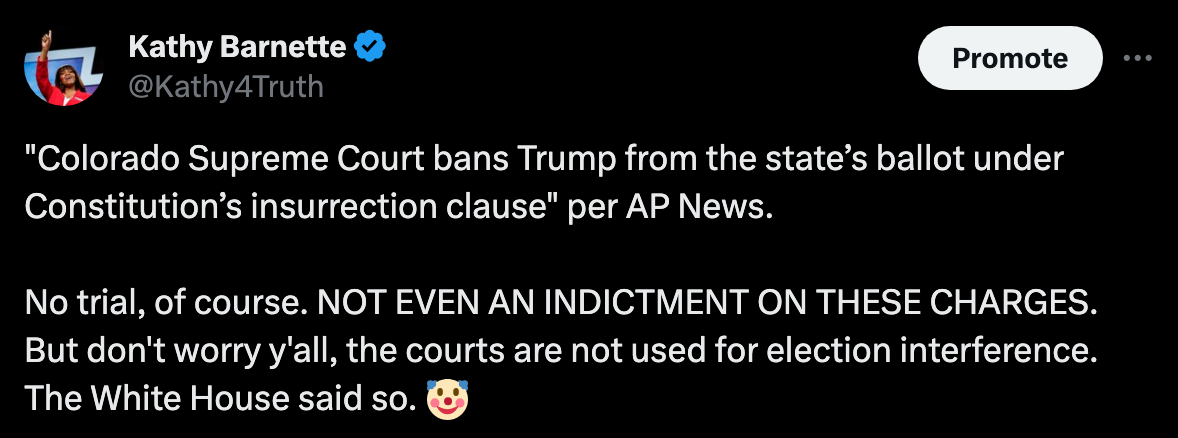 Friends, I will not mince words. (I know, I never do) Today might mark the end of the American Republic as we know it. This is *peak* banana Republic behavior. The US has put sanctions on countries for doing exactly what the Colorado Supreme Court has just done. Some will say that the US Supreme Court will overturn this decision. Probably, but this is missing the point. The very core of a “government of the people, by the people, for the people” has just been attacked. We, the people, need to stand for the founding principles of this *once-great* Nation. We, the people, decide who leads us. “BY THE PEOPLE”. Some people don’t seem to understand. Actually, they do. They know precisely what they are doing. And We, the people, need to speak up. Do I sound pissed? Well, I am. And you should be too. Whether you like Trump or not. Blessings. Don’t miss any of my posts, subscribe to my Substack: Make sure you guys: Step 1: LISTEN Step 2: SUBSCRIBE Step 3: RATE 5🌟 Step 4: SHARE w/ others Purchase my book on Amazon: |
