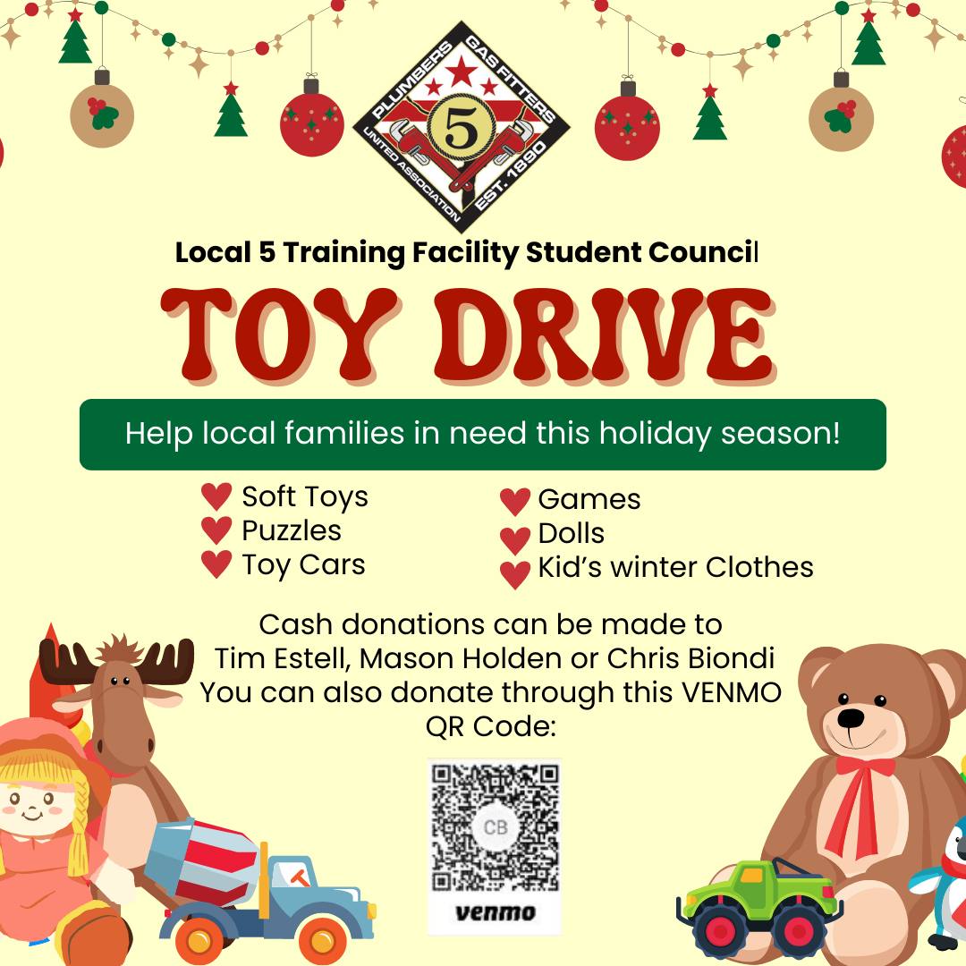 Plumbers & Gasfitters Local 5 is organizing one final toy drive before the holidays arrive! Help local families in need by bringing UNWRAPPED toys in good condition to the Local 5 Training Facility (5000 Forbes Blvd, Lanham, MD 20706). You can also donate cash to Tim Estell, Chris Biondi or Mason Holden, or by using the QR code at right (@chrisbeyond on Venmo). Thank you and happy holidays to all!